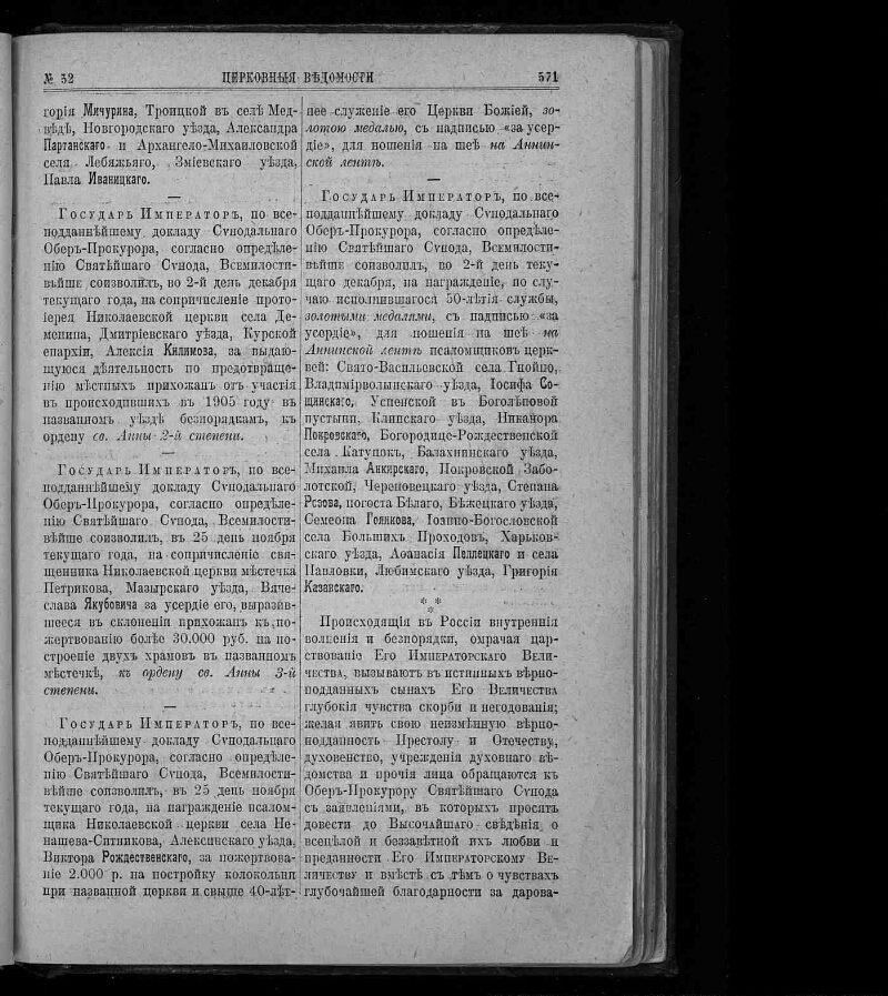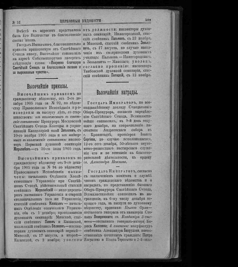Церковные ведомости, издаваемые при Святейшем правительствующем Синоде : еженедельное издание с прибавлениями. - Санкт-Петербург, 1888-1918. - Выходит в 2-х частях: официальная и неофициальная. Неофициальная часть выходит под заглавием: Прибавления к Церковным ведомостям. За 1915-1916 гг. приложение к газете: Приходский листок. Заглавие: 1888-1917 № 8, 1918 № 1-3/4 Издаваемые при Святейшем правительствующем Синоде. Еженедельное издание с прибавлениями ; 1917 № 9/15-48/49 ... Еженедельное издание ; 1918 № 5-19/20 Издание православной русской церкви. Еженедельное издание с прибавлениями ; 1918 № 21/22 Издание православной русской церкви. Издание с прибавлениями ; 1918 № 23/24 Издание православной русской церкви. Издательство: 1918 № 1-3/4 Издательский совет при Святейшем Синоде ; 1918 № 5-23/24 Издательский совет при Священном Синоде. Приложения: Приходское чтение ; Определения Синода, молитвы, листовки, воззвания и т.п. : 101 брошюра. Алфавитно-предметный указатель к официальной части "Церковных ведомостей" за 1888-1897 годы : приложение к журналу. Санкт-Петербург, 1899. - Алфавитно-предметный указатель к официальной части "Церковных ведомостей" за 1898-1910 годы : приложение к журналу ... 1911, № 1-46. Санкт-Петербург, 1911.