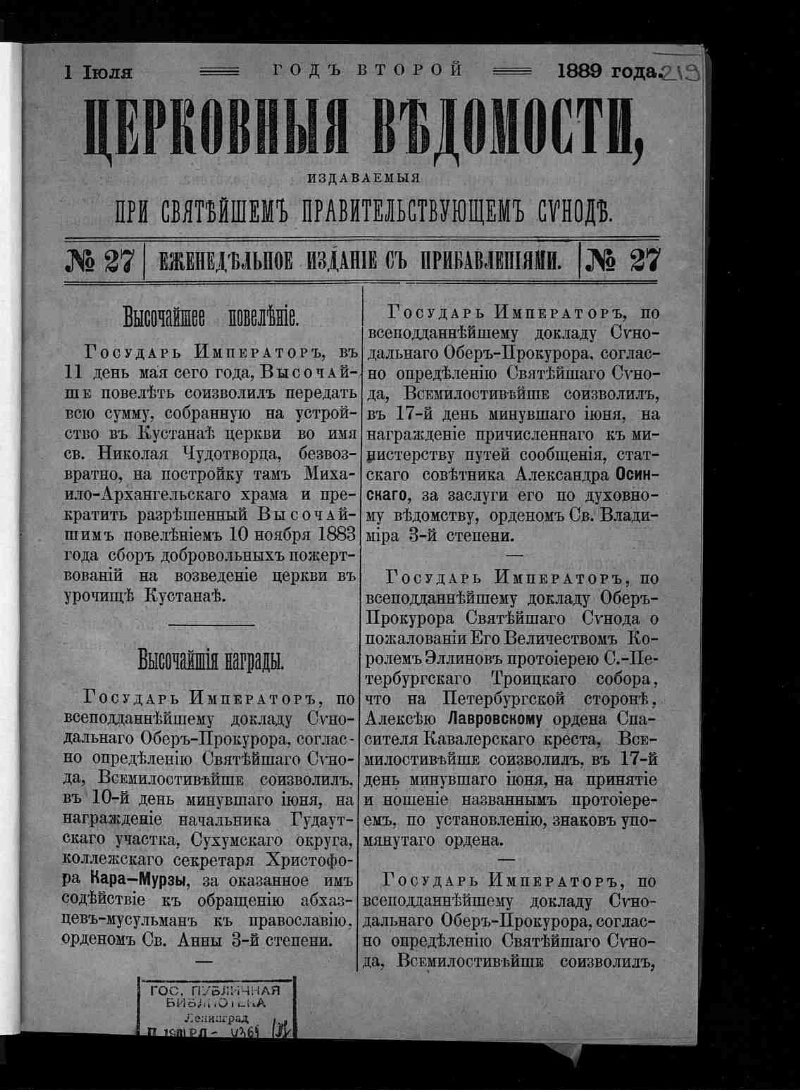 Г. 2 1889, № 27 (1 июля). - [Синод. тип.], 1889. - [48] с. разд. паг. - В кн. также: Прибавления.... - Библиогр. в подстроч. примеч. и в тексте.