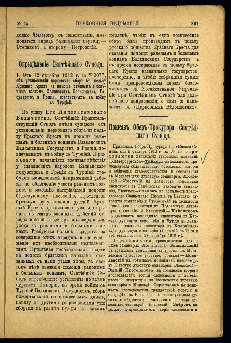 Церковные ведомости, издаваемые при Святейшем правительствующем Синоде : еженедельное издание с прибавлениями. - Санкт-Петербург, 1888-1918. - Выходит в 2-х частях: официальная и неофициальная. Неофициальная часть выходит под заглавием: Прибавления к Церковным ведомостям. За 1915-1916 гг. приложение к газете: Приходский листок. Заглавие: 1888-1917 № 8, 1918 № 1-3/4 Издаваемые при Святейшем правительствующем Синоде. Еженедельное издание с прибавлениями ; 1917 № 9/15-48/49 ... Еженедельное издание ; 1918 № 5-19/20 Издание православной русской церкви. Еженедельное издание с прибавлениями ; 1918 № 21/22 Издание православной русской церкви. Издание с прибавлениями ; 1918 № 23/24 Издание православной русской церкви. Издательство: 1918 № 1-3/4 Издательский совет при Святейшем Синоде ; 1918 № 5-23/24 Издательский совет при Священном Синоде. Приложения: Приходское чтение ; Определения Синода, молитвы, листовки, воззвания и т.п. : 101 брошюра. Алфавитно-предметный указатель к официальной части "Церковных ведомостей" за 1888-1897 годы : приложение к журналу. Санкт-Петербург, 1899. - Алфавитно-предметный указатель к официальной части "Церковных ведомостей" за 1898-1910 годы : приложение к журналу ... 1911, № 1-46. Санкт-Петербург, 1911.