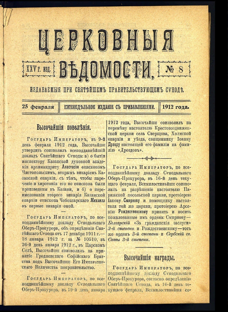 Церковные ведомости, издаваемые при Святейшем правительствующем Синоде : еженедельное издание с прибавлениями. - Санкт-Петербург, 1888-1918. - Выходит в 2-х частях: официальная и неофициальная. Неофициальная часть выходит под заглавием: Прибавления к Церковным ведомостям. За 1915-1916 гг. приложение к газете: Приходский листок. Заглавие: 1888-1917 № 8, 1918 № 1-3/4 Издаваемые при Святейшем правительствующем Синоде. Еженедельное издание с прибавлениями ; 1917 № 9/15-48/49 ... Еженедельное издание ; 1918 № 5-19/20 Издание православной русской церкви. Еженедельное издание с прибавлениями ; 1918 № 21/22 Издание православной русской церкви. Издание с прибавлениями ; 1918 № 23/24 Издание православной русской церкви. Издательство: 1918 № 1-3/4 Издательский совет при Святейшем Синоде ; 1918 № 5-23/24 Издательский совет при Священном Синоде. Приложения: Приходское чтение ; Определения Синода, молитвы, листовки, воззвания и т.п. : 101 брошюра. Алфавитно-предметный указатель к официальной части "Церковных ведомостей" за 1888-1897 годы : приложение к журналу. Санкт-Петербург, 1899. - Алфавитно-предметный указатель к официальной части "Церковных ведомостей" за 1898-1910 годы : приложение к журналу ... 1911, № 1-46. Санкт-Петербург, 1911.