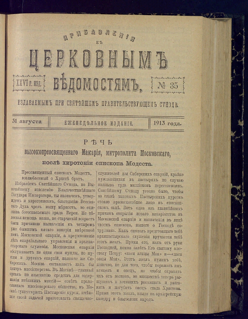 Г. 26 1913, № 35 (31 августа). - 1913. - 1545-1600 с. : ил. - Загл. вып.: Прибавления к Церковным ведомостям, издаваемым при Святейшем правительствующем синоде. Библиогр. в подстроч. примеч. и в тексте отд. статей.