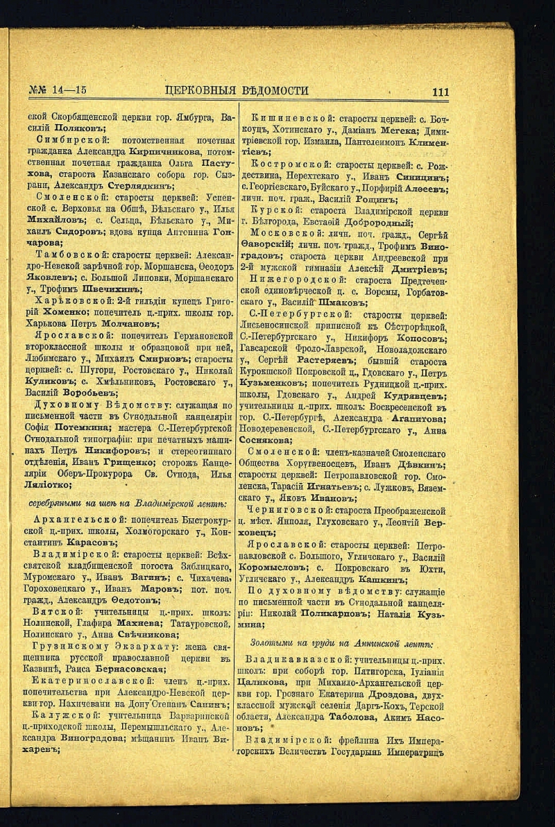 Церковные ведомости, издаваемые при Святейшем правительствующем Синоде : еженедельное издание с прибавлениями. - Санкт-Петербург, 1888-1918. - Выходит в 2-х частях: официальная и неофициальная. Неофициальная часть выходит под заглавием: Прибавления к Церковным ведомостям. За 1915-1916 гг. приложение к газете: Приходский листок. Заглавие: 1888-1917 № 8, 1918 № 1-3/4 Издаваемые при Святейшем правительствующем Синоде. Еженедельное издание с прибавлениями ; 1917 № 9/15-48/49 ... Еженедельное издание ; 1918 № 5-19/20 Издание православной русской церкви. Еженедельное издание с прибавлениями ; 1918 № 21/22 Издание православной русской церкви. Издание с прибавлениями ; 1918 № 23/24 Издание православной русской церкви. Издательство: 1918 № 1-3/4 Издательский совет при Святейшем Синоде ; 1918 № 5-23/24 Издательский совет при Священном Синоде. Приложения: Приходское чтение ; Определения Синода, молитвы, листовки, воззвания и т.п. : 101 брошюра. Алфавитно-предметный указатель к официальной части "Церковных ведомостей" за 1888-1897 годы : приложение к журналу. Санкт-Петербург, 1899. - Алфавитно-предметный указатель к официальной части "Церковных ведомостей" за 1898-1910 годы : приложение к журналу ... 1911, № 1-46. Санкт-Петербург, 1911.