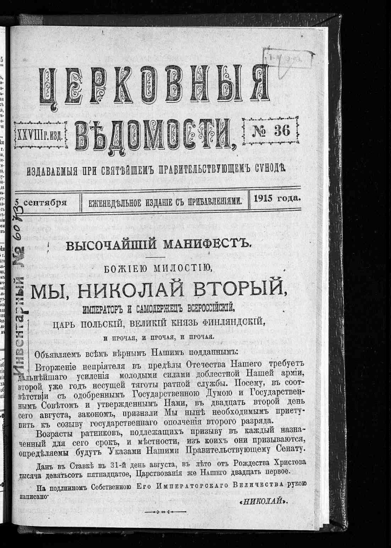 Г. 28 1915, № 36 (5 сентября). - Петроград : Синод. тип., 1915. - [54] с. разд. паг. - В книге также: Прибавления.... - Библиогр. в подстроч. примеч.