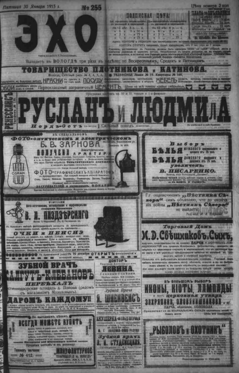 Автор Федоров М. Пошешулина Е. Описание Эхо . - Вологда : Тип.: И. П. Пошешулина , 1913-1917 1915, № 255 (30 янв.). - 1915. - 4 с. . 1. Народ (коллекция). 2. Территория России (коллекция). 3. Вологодская губерния -- История -- Периодические издания. 4. Региональные газеты. ББК 63.3(2)533 Источник электронной копии: Вологодская ОУНБМесто хранения оригинала: Вологодская ОУНБ Издательство Тип.: И. П. Пошешулина Объект в каталогах Россия в период 1907-1914 гг. В коллекциях Отечественная периодика в фонде Президентской библиотеки → Газеты → Э → Эхо. Вологда, 1913-1918. → 1915 из 4