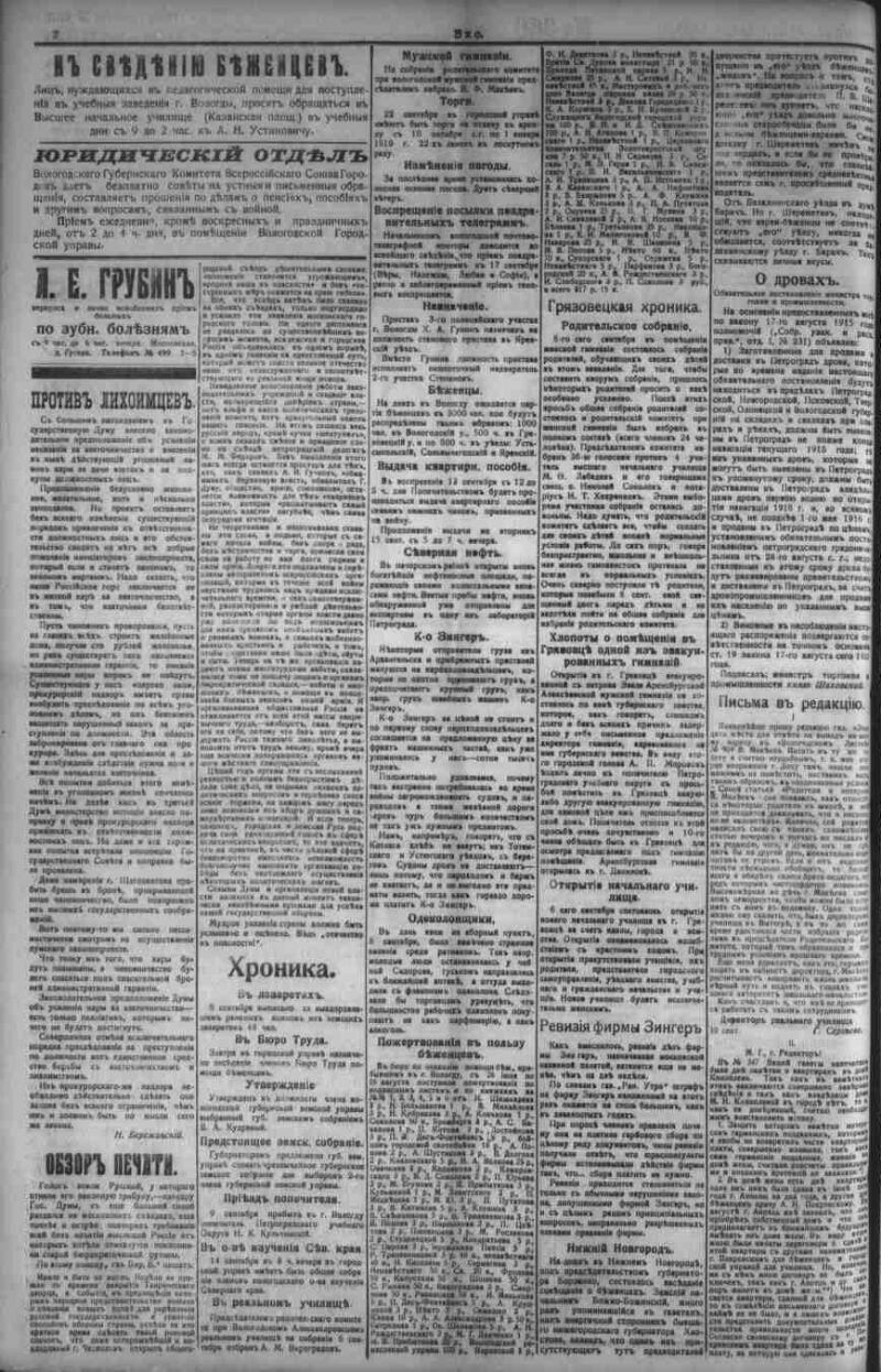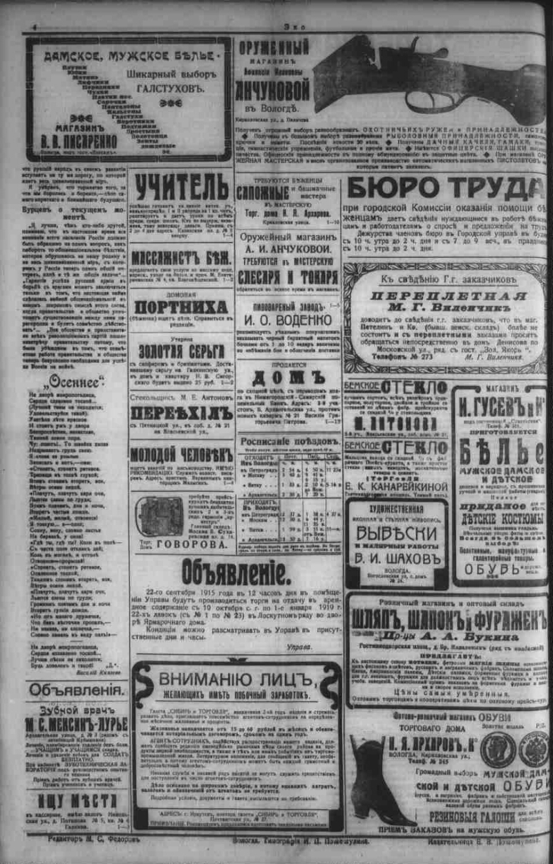 Автор Федоров М. Пошешулина Е. Описание Эхо . - Вологда : Тип.: И. П. Пошешулина , 1913-1917 1915, № 350 (11 сент.). - 1915. - 4 с. . 1. Народ (коллекция). 2. Территория России (коллекция). 3. Вологодская губерния -- История -- Периодические издания. 4. Региональные газеты. ББК 63.3(2)533 Источник электронной копии: Вологодская ОУНБМесто хранения оригинала: Вологодская ОУНБ Издательство Тип.: И. П. Пошешулина Объект в каталогах Россия в период 1907-1914 гг. В коллекциях Отечественная периодика в фонде Президентской библиотеки → Газеты → Э → Эхо. Вологда, 1913-1918. → 1915 из 4