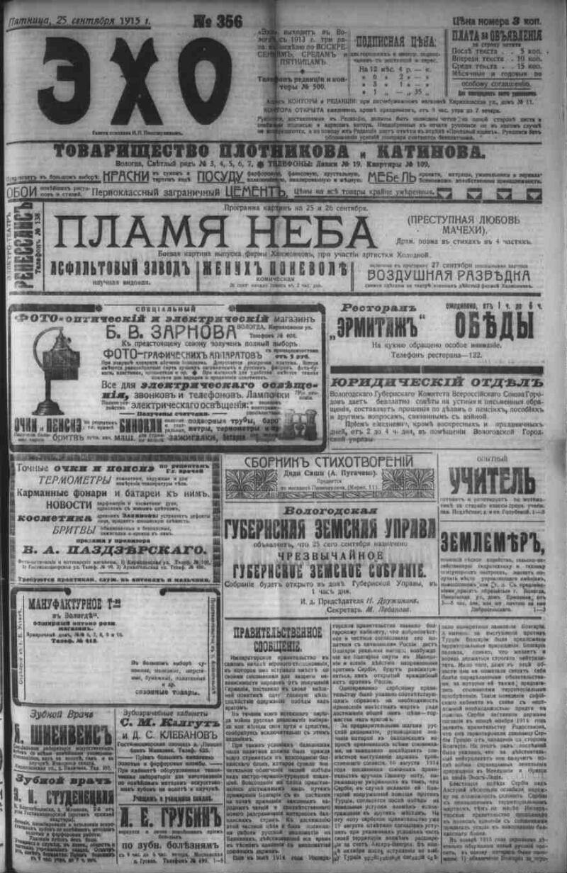 Автор Федоров М. Пошешулина Е. Описание Эхо . - Вологда : Тип.: И. П. Пошешулина , 1913-1917 1915, № 356 (25 сент.). - 1915. - 4 с. . 1. Народ (коллекция). 2. Территория России (коллекция). 3. Вологодская губерния -- История -- Периодические издания. 4. Региональные газеты. ББК 63.3(2)533 Источник электронной копии: Вологодская ОУНБМесто хранения оригинала: Вологодская ОУНБ Издательство Тип.: И. П. Пошешулина Объект в каталогах Россия в период 1907-1914 гг. В коллекциях Отечественная периодика в фонде Президентской библиотеки → Газеты → Э → Эхо. Вологда, 1913-1918. → 1915 из 4