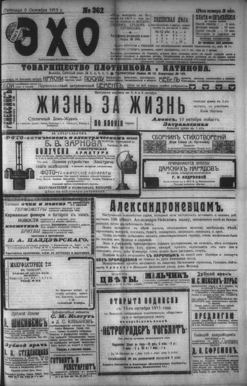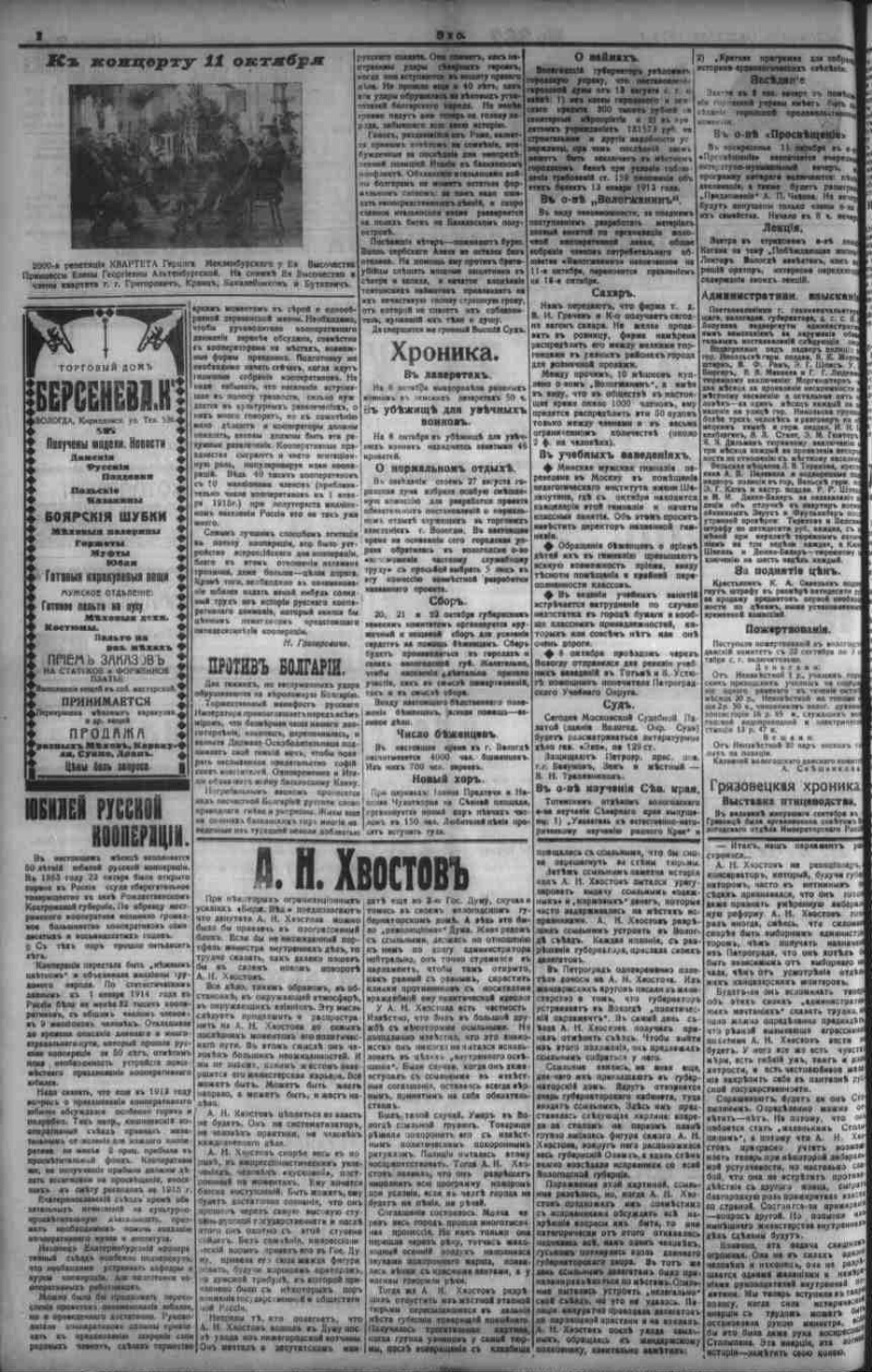 Автор Федоров М. Пошешулина Е. Описание Эхо . - Вологда : Тип.: И. П. Пошешулина , 1913-1917 1915, № 362 (9 окт.). - 1915. - 4 с. . 1. Народ (коллекция). 2. Территория России (коллекция). 3. Вологодская губерния -- История -- Периодические издания. 4. Региональные газеты. ББК 63.3(2)533 Источник электронной копии: Вологодская ОУНБМесто хранения оригинала: Вологодская ОУНБ Издательство Тип.: И. П. Пошешулина Объект в каталогах Россия в период 1907-1914 гг. В коллекциях Отечественная периодика в фонде Президентской библиотеки → Газеты → Э → Эхо. Вологда, 1913-1918. → 1915 из 4