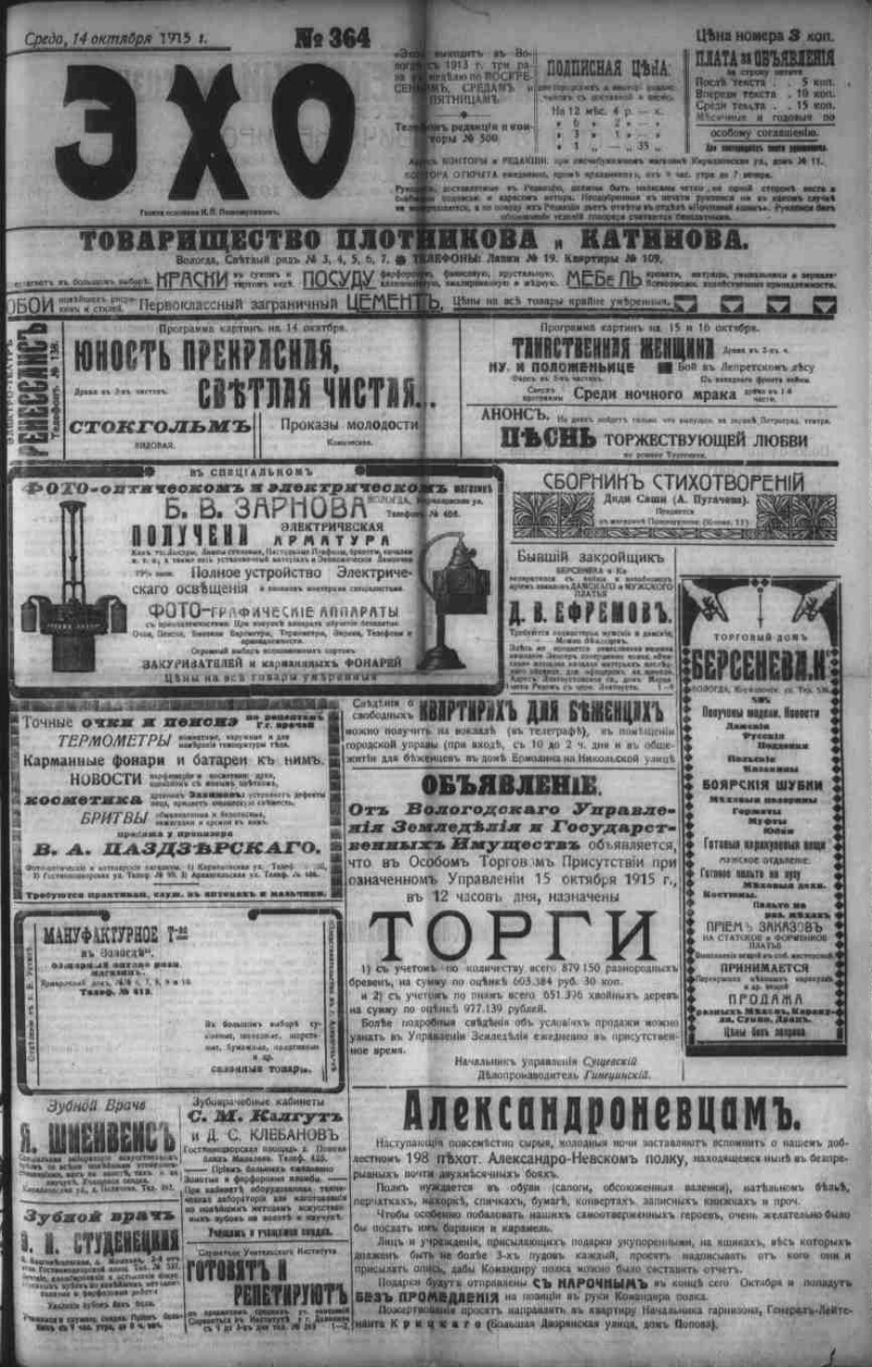Автор Федоров М. Пошешулина Е. Описание Эхо . - Вологда : Тип.: И. П. Пошешулина , 1913-1917 1915, № 364 (14 окт.). - 1915. - 4 с. . 1. Народ (коллекция). 2. Территория России (коллекция). 3. Вологодская губерния -- История -- Периодические издания. 4. Региональные газеты. ББК 63.3(2)533 Источник электронной копии: Вологодская ОУНБМесто хранения оригинала: Вологодская ОУНБ Издательство Тип.: И. П. Пошешулина Объект в каталогах Россия в период 1907-1914 гг. В коллекциях Отечественная периодика в фонде Президентской библиотеки → Газеты → Э → Эхо. Вологда, 1913-1918. → 1915 из 4