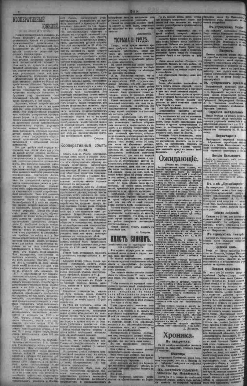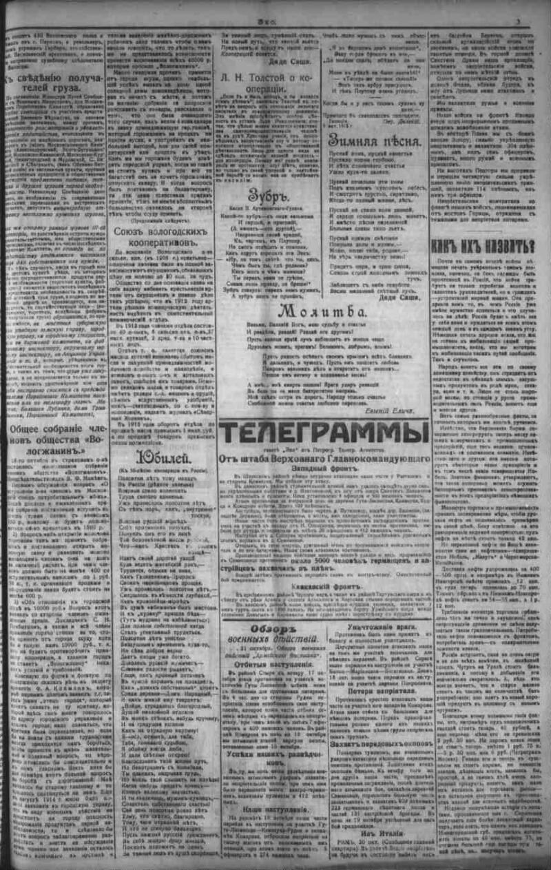 Автор Федоров М. Пошешулина Е. Описание Эхо . - Вологда : Тип.: И. П. Пошешулина , 1913-1917 1915, № 368 (22 окт.). - 1915. - 4 с. . 1. Народ (коллекция). 2. Территория России (коллекция). 3. Вологодская губерния -- История -- Периодические издания. 4. Региональные газеты. ББК 63.3(2)533 Источник электронной копии: Вологодская ОУНБМесто хранения оригинала: Вологодская ОУНБ Издательство Тип.: И. П. Пошешулина Объект в каталогах Россия в период 1907-1914 гг. В коллекциях Отечественная периодика в фонде Президентской библиотеки → Газеты → Э → Эхо. Вологда, 1913-1918. → 1915 из 4