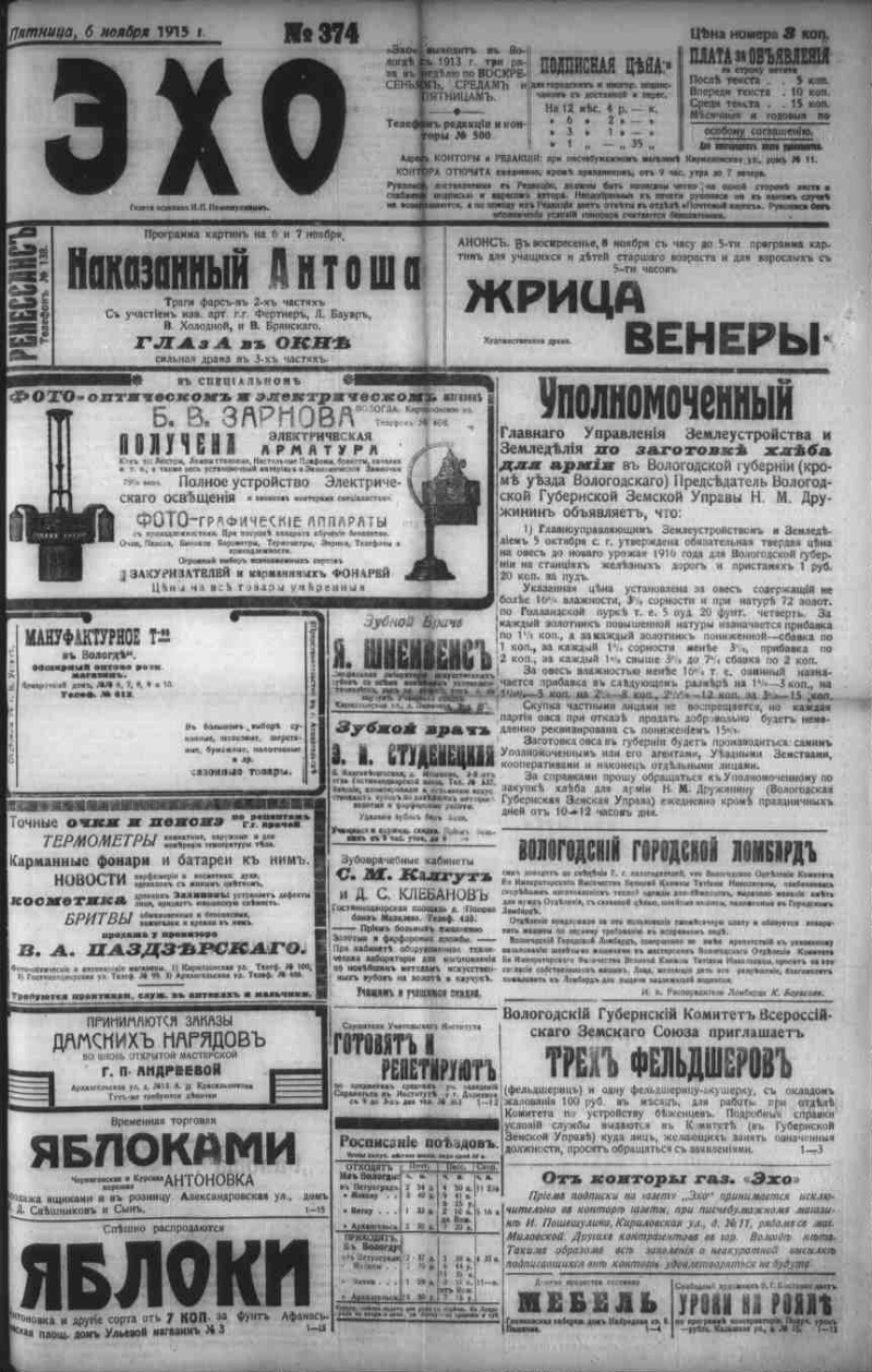 Автор Федоров М. Пошешулина Е. Описание Эхо . - Вологда : Тип.: И. П. Пошешулина , 1913-1917 1915, № 374 (6 нояб.). - 1915. - 4 с. . 1. Народ (коллекция). 2. Территория России (коллекция). 3. Вологодская губерния -- История -- Периодические издания. 4. Региональные газеты. ББК 63.3(2)533 Источник электронной копии: Вологодская ОУНБМесто хранения оригинала: Вологодская ОУНБ Издательство Тип.: И. П. Пошешулина Объект в каталогах Россия в период 1907-1914 гг. В коллекциях Отечественная периодика в фонде Президентской библиотеки → Газеты → Э → Эхо. Вологда, 1913-1918. → 1915 из 4