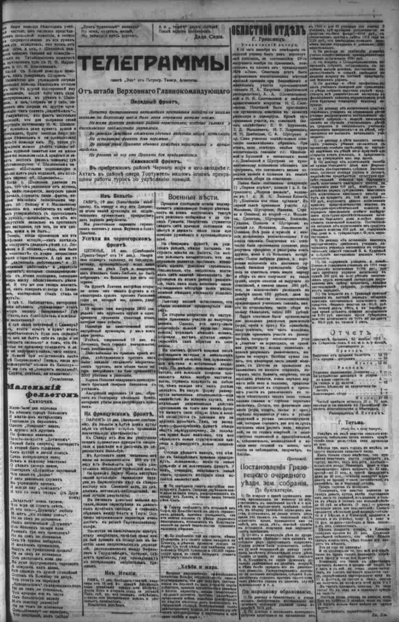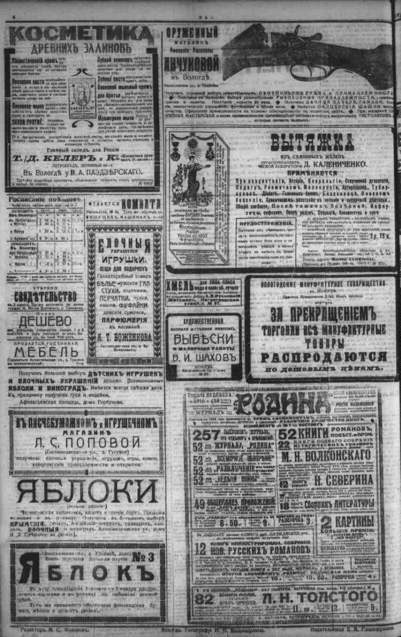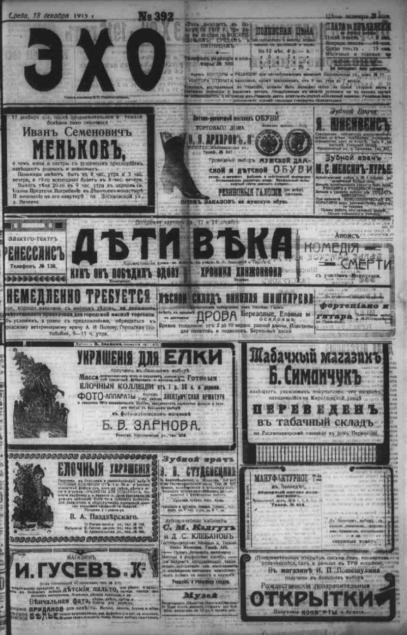 Автор Федоров М. Пошешулина Е. Описание Эхо . - Вологда : Тип.: И. П. Пошешулина , 1913-1917 1915, № 392 (18 дек.). - 1915. - 4 с. . 1. Народ (коллекция). 2. Территория России (коллекция). 3. Вологодская губерния -- История -- Периодические издания. 4. Региональные газеты. ББК 63.3(2)533 Источник электронной копии: Вологодская ОУНБМесто хранения оригинала: Вологодская ОУНБ Издательство Тип.: И. П. Пошешулина Объект в каталогах Россия в период 1907-1914 гг. В коллекциях Отечественная периодика в фонде Президентской библиотеки → Газеты → Э → Эхо. Вологда, 1913-1918. → 1915 из 4
