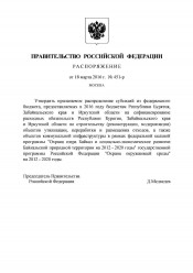 [О распределении субсидий субъектам Федерации на реализацию мер по охране озера Байкал и социально-экономическому развитию Байкальской природной территории] : Распоряжение Правительства Российской Федерации от 18 марта 2016 г. № 451-р. - Москва, 2016. - 1, 2 листа. - В конце текста подпись: Председатель Правительства Российской Федерации Д. Медведев. Место подписания: Москва. Электронная версия правового акта (3 файла, 300 dpi, JPEG, 1,6 МБ). Содержит: Распределение субсидий из федерального бюджета предоставляемых а 2016 году бюджетам Республики Бурятия, Забайкальского края и Иркутской области на софинансирование расходных обязательств Республики Бурятия, Забайкальского края и Иркутской области по строительству (реконструкции, модернизации) объектов утилизации, переработки и размещения отходов, а также объектов коммунальной инфраструктуры в рамках федеральной целевой программы "Охрана озера Байкал и социально-экономическое развитие Байкальской природной территории на 2012-2020 годы" государственной программы Российской Федерации "Охрана окружающей среды" на 2021-2020 годы: утверждено распоряжением Правительства Российской Федерации от 18 марта 2016 г. № 451-р. - Опубликовано в изданиях: Собрание законодательства Российской Федерации от 2016 г., № 13, ст. 1865 ; Официальный интернет-портал правовой информации (www.pravo.gov.ru) от 22.03.2016 г. (№ 0001201603220018).