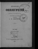 Русский филологический вестник : учено-педагогический журнал. - Т. 1-77. - Варшава, 1879-1917. - Подзаголовки: 1879 Т. 1, 2 - 1880 Т. 2 Ученый журнал, издаваемый под редакцией М. А. Колосова ; 1880 Т. 3 - 1904 Т. 51 Ученый журнал, издаваемый под редакцией А. И. Смирнова ; 1904 Т. 52 - 1917 Учено-педагогический журнал, издаваемый под редакцией Е. Ф. Карского. Печатался с 1879 года в Варшаве, в типографии М. Земкевича и В. Ноаковского, в типографии Варшавского учебного округа; с 1915 года в Москве в Синодальной типографии ; в 1917 году т. 77 № 1/2 - в Петрограде, в типографии А. В. Орлова, т. 78 № 3/4 в Казани, в типо-литографии Университета. "Русский филологический вестник" - научный языковедческий и историко-литературный журнал, основанный в 1879 году профессором М. А. Колосовым. До 1915 года издавался в Варшаве, в 1915-1917 гг. - в Москве, Петрограде и Казани. Периодичность: четыре номера в год (два номера составляли том). Всего вышло 78 томов. В журнале публиковались исследования о языке, народной поэзии, древнерусской и славянской литературах, статьи и заметки по новой русской литературе, большое место занимали работы по сравнительному и общему языкознанию, истории русского языка и славянской палеографии. С 1907 в "Русском филологическом вестнике" печатались труды Московской диалектологической комиссии