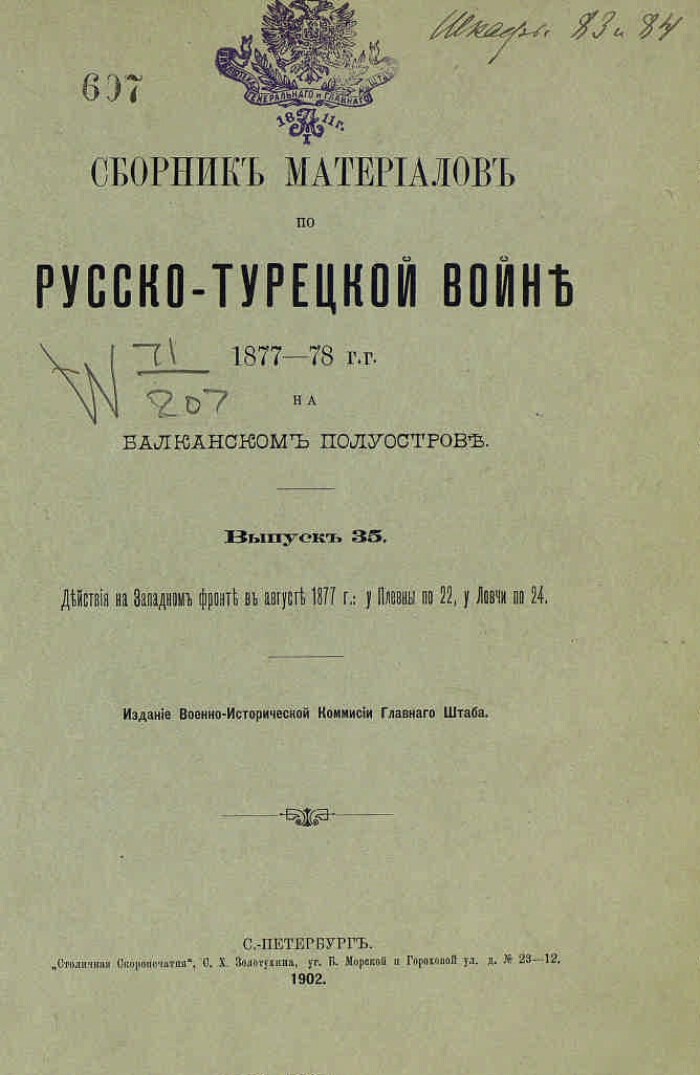 Сборник материалов по Русско-турецкой войне 1877-78 гг. на Балканском полуострове. - Санкт-Петербург : издание Военно-исторической комиссии Главного штаба, 1898-1911. - 28 см. - Изд-во вып. 33, 39, 45, 48, 50, 51, 53-97: издание Военно-исторической комиссии Главного управления Генерального штаба.
