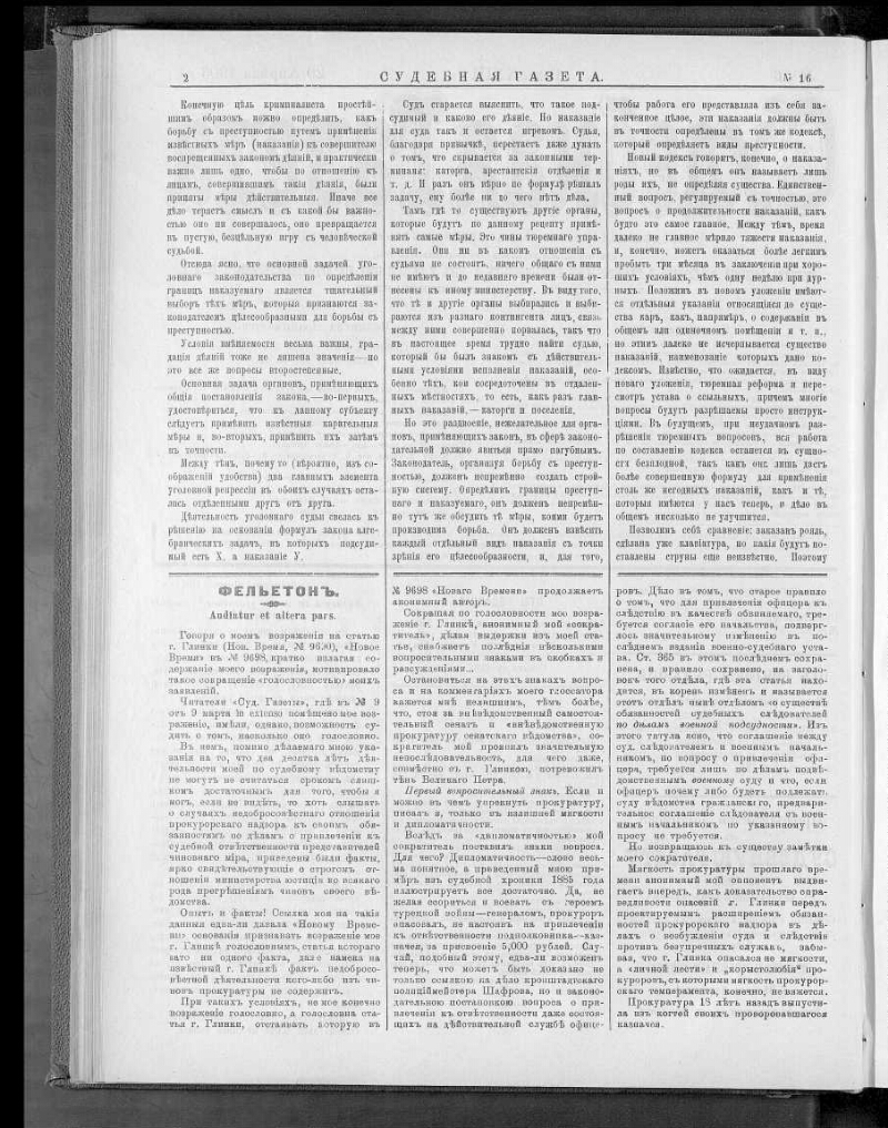 Судебная газета : еженедельная газета без предварительной цензуры / редактор-издатель Ф. В. де-Веки. - 1882, 17 октября - [1905], [?]. -Санкт-Петербург, 1882-1905. - Газета издавалась еженедельно (по воскресеньям), в Санкт-Петербурге в 1882-1905 гг., с приложением Сборника решений уголовного и гражданского кассационных департаментов и общего собрания Правительствующего Сената. Редактор-издатель Ф. В. де-Веки. В 1886 г. выходили приложения к отдельным номерам. Указатели за 1882 - 1883 гг.