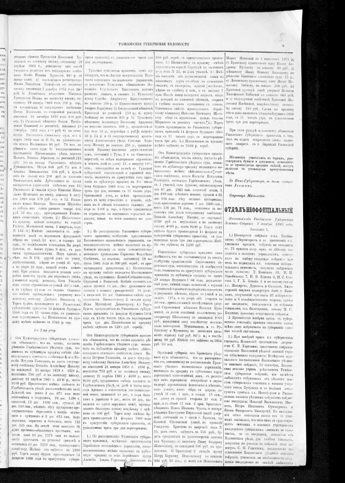 Тамбовские губернские ведомости. - 1838, 8 января - [?]. -Тамбов, 1838-1917. - Газета издавалась при Тамбовском Губернском Правлении с 1838 г. Первоначально выходила еженедельно, с половины 1876 г. 2 раза в неделю, с половины 1877 г. выходила 3 раза в неделю. С 1838 по 1 марта 1907 выходили в 2 части: официальная и неофициальная; с 1838 по март 1845 неофициальная часть издавалась как прибавление к номеру. Библиография: Указатель статей, помещенных в неофициальном отделе "Тамбовских губернских ведомостей" за 1870 - 1877 гг. / М. П. Григоровский ; Указатель статей, помещенных в неофициальном отделе "Тамбовских губернских ведомостей" за 1838 - 1840 гг. / Соловский В. В. ; Указатель статей, помещенных в неофициальном отделе "Тамбовских губернских ведомостей" за 1841 - 1842 гг.