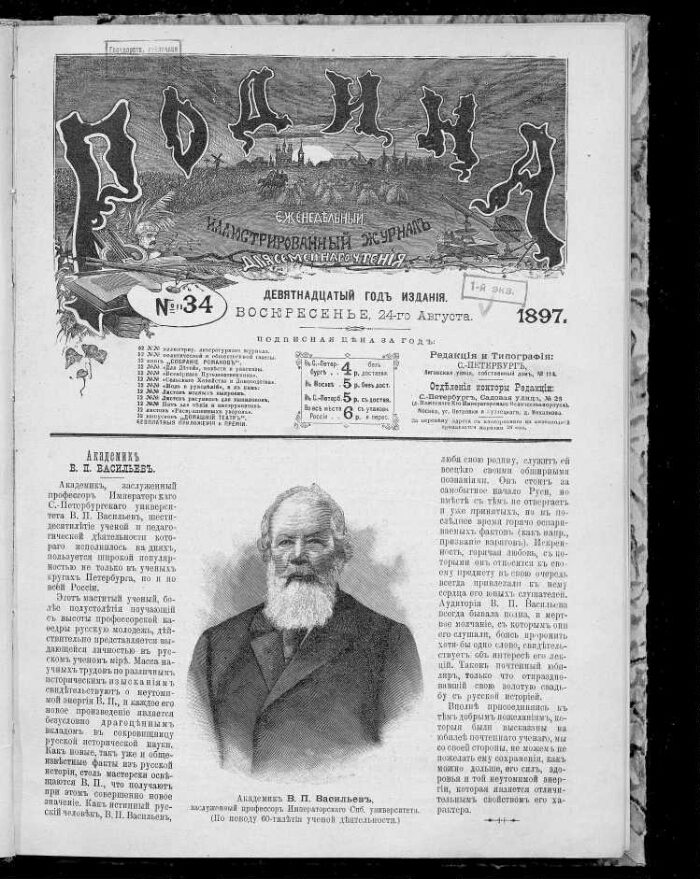 Родина : литературно-художественный семейный журнал с иллюстрированными отделами "Всемирное обозрение" и "Развлечение в часы отдыха". - Санкт-Петербург : Акционерное общество издательства А. А. Каспари, 1879-1917. - "Родина" - иллюстрированный журнал для семейного чтения, основан в Санкт-Петербурге в 1879 г. В. А. Захаровым, выходил ежемесячно, с 1883 г. – еженедельно. В 1879-1880 гг. выходило с приложением "Вестник народной помощи"; за 1884 г. - с приложением "Прогрессивное сельское хозяйство". В 1886 г. журнал приобрёл А. А. Каспари. С этого времени журнал начинает печатать ежемесячные приложения ("Развлечение в часы отдыха", иллюстрированное "Всемирное обозрение", еженедельная политическая и общественная газета "Родина") и до 1917 года издавался под его редакцией. С августа 1883 г. журнал реорганизован в газету и вновь начинает нумерацию выпусков. В 1888-1912 гг. издание выходит 2-мя параллельными частями с заглавием "Родина: еженедельный иллюстрированный журнал для семейного чтения" и "Родина: еженедельная газета политическая, общественная и литературная"; к каждому году имеется общий титульный лист с заглавием: "Родина: еженедельный иллюстрированный литературный журнал и политическая общественная газета"; На № 52 1911 г. самостоятельное издание газеты прекращено; в 1912 г. в каждом номере журнала имеется газетный отдел с заглавием: "Родина: еженедельные обзоры политики и общественной жизни: газетный отдел журнала "Родина". К 1917 г. выходило с приложением "Свободная Россия". Подзаголовок: 1878 Кн. 1 Народный журнал (с картинами); 1879 Кн. 2 - 1883 июнь/июль Ежемесячный журнал с картинами (с незначительными изменениями); 1883 № 1 (август) - 1885 Еженедельнная газета общественная и литературная; 1886-1887 Еженедельная иллюстрированная газета политическая, общественная и литературная (с незначительными изменениями); В журнале: 1888-1916 Иллюстрированный журнал для семейного чтения. (На обложке 1907 г. Литературно-художественный журнал и газета с иллюстрированными отделами "Всемирное обозрение" и "Развлечение в часы отдыха"; 1908-1916: Литературно-художественный семейный журнал с иллюстрированными отделами "Всемирное обозрение" и "Развлечение в часы отдыха"; в части номеров 1915-1916 г.: Еженедельный иллюстрированный журнал с бесплатным приложением и книгами романов); 1917 Еженедельный литературно-художественный журнал (На обложке: Литературно-художественный семейный журнал, в части номеров: ... с иллюстрированными отделами "Всемирное обозрение" и "Развлечение", в части номеров: Еженедельный иллюстрированный журнал с бесплатным приложением и книгами романов); В газете: 1888-1901 № 48 Еженедельная газета политическая, общественная и литературная; 1901 № 49 - 1903 Еженедельня газета. Политика, новости дня, общественная жизнь и пр.; 1904-1911 Еженедельная общественная и политическая газета (С 1909 г. ... Бесплатное приложение к журналу "Родина"). Издательство: 1879 - 1884 № 17 А. Траншель; 1884 № 18 - 1886 № 6, 16-17 И. Н. Пономарев; 1886 № 7-15 И. Н. Пономарев и В. М. Антонов; 1886 № 18 - 1913 № 42 А. А. Каспари; 1913 № 43 - 1914 № 34 издательница А. А. Каспари; 1914 № 35 - 1917 Акционерное общество издательства А. А. Каспари.