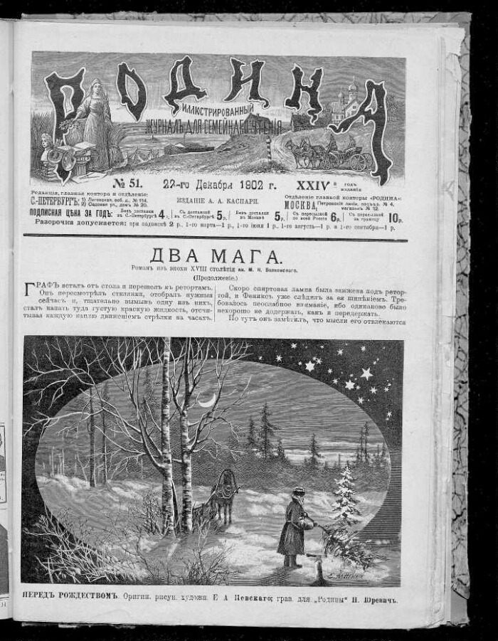 Родина : литературно-художественный семейный журнал с иллюстрированными отделами "Всемирное обозрение" и "Развлечение в часы отдыха". - Санкт-Петербург : Акционерное общество издательства А. А. Каспари, 1879-1917. - "Родина" - иллюстрированный журнал для семейного чтения, основан в Санкт-Петербурге в 1879 г. В. А. Захаровым, выходил ежемесячно, с 1883 г. – еженедельно. В 1879-1880 гг. выходило с приложением "Вестник народной помощи"; за 1884 г. - с приложением "Прогрессивное сельское хозяйство". В 1886 г. журнал приобрёл А. А. Каспари. С этого времени журнал начинает печатать ежемесячные приложения ("Развлечение в часы отдыха", иллюстрированное "Всемирное обозрение", еженедельная политическая и общественная газета "Родина") и до 1917 года издавался под его редакцией. С августа 1883 г. журнал реорганизован в газету и вновь начинает нумерацию выпусков. В 1888-1912 гг. издание выходит 2-мя параллельными частями с заглавием "Родина: еженедельный иллюстрированный журнал для семейного чтения" и "Родина: еженедельная газета политическая, общественная и литературная"; к каждому году имеется общий титульный лист с заглавием: "Родина: еженедельный иллюстрированный литературный журнал и политическая общественная газета"; На № 52 1911 г. самостоятельное издание газеты прекращено; в 1912 г. в каждом номере журнала имеется газетный отдел с заглавием: "Родина: еженедельные обзоры политики и общественной жизни: газетный отдел журнала "Родина". К 1917 г. выходило с приложением "Свободная Россия". Подзаголовок: 1878 Кн. 1 Народный журнал (с картинами); 1879 Кн. 2 - 1883 июнь/июль Ежемесячный журнал с картинами (с незначительными изменениями); 1883 № 1 (август) - 1885 Еженедельнная газета общественная и литературная; 1886-1887 Еженедельная иллюстрированная газета политическая, общественная и литературная (с незначительными изменениями); В журнале: 1888-1916 Иллюстрированный журнал для семейного чтения. (На обложке 1907 г. Литературно-художественный журнал и газета с иллюстрированными отделами "Всемирное обозрение" и "Развлечение в часы отдыха"; 1908-1916: Литературно-художественный семейный журнал с иллюстрированными отделами "Всемирное обозрение" и "Развлечение в часы отдыха"; в части номеров 1915-1916 г.: Еженедельный иллюстрированный журнал с бесплатным приложением и книгами романов); 1917 Еженедельный литературно-художественный журнал (На обложке: Литературно-художественный семейный журнал, в части номеров: ... с иллюстрированными отделами "Всемирное обозрение" и "Развлечение", в части номеров: Еженедельный иллюстрированный журнал с бесплатным приложением и книгами романов); В газете: 1888-1901 № 48 Еженедельная газета политическая, общественная и литературная; 1901 № 49 - 1903 Еженедельня газета. Политика, новости дня, общественная жизнь и пр.; 1904-1911 Еженедельная общественная и политическая газета (С 1909 г. ... Бесплатное приложение к журналу "Родина"). Издательство: 1879 - 1884 № 17 А. Траншель; 1884 № 18 - 1886 № 6, 16-17 И. Н. Пономарев; 1886 № 7-15 И. Н. Пономарев и В. М. Антонов; 1886 № 18 - 1913 № 42 А. А. Каспари; 1913 № 43 - 1914 № 34 издательница А. А. Каспари; 1914 № 35 - 1917 Акционерное общество издательства А. А. Каспари.