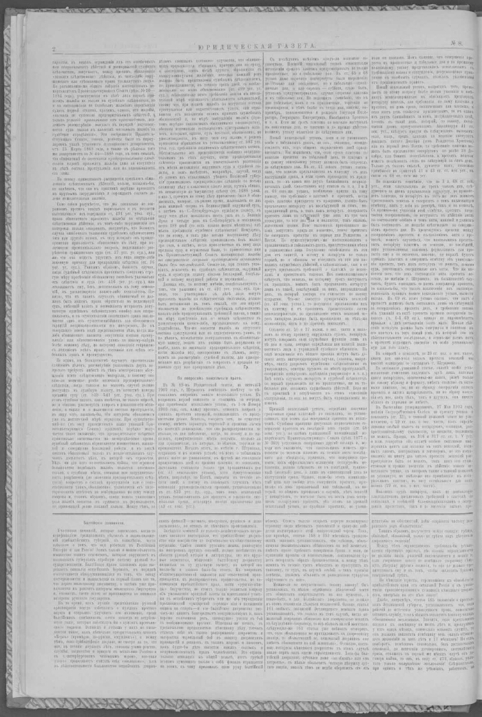 Юридическая газета : выходит без предварительной цензуры. - 1892, 4 января - [1906]. -Санкт-Петербург, 1892-1906. - "Юридическая газета" с бесплатным приложением Сборника решений Уголовного и Гражданского департаментов и общего собрания правительствующего сената, а с 1895 и Собраний узаконении и распоряжений правительства - выходила в Петербурге с января 1892 по 1906, 2 раза в неделю, по воскресеньям и четвергам. Редакторы - Е. Антонов, Д. В. Чичинадзе, М. В. Чичинадзе. Материалы газеты печатались под рубриками: Законодательная хроника в России, Обзор постановлений отечественного и иностранного законодательства, Статьи и заметки по вопросам, возникающим в судебной и административной практике, Корреспонденции из России, Выдающиеся судебные процессы, Речи известных адвокатов. С № 6 1906 стала выходить в виде брошюр. Алфавитный указатель статей за 1901 год: в № 32 за 30 декабря 1901 г.. - Алфавитный указатель к "Юридической газете" за 1892 и 1893 гг. - Санкт-Петербург, 1894. - Приложения: "Сборник решений Уголовного и Гражданского кассационных департаментов и Общего собрания Правительствующего сената" и "Собрание узаконений и распоряжений Правительства".
