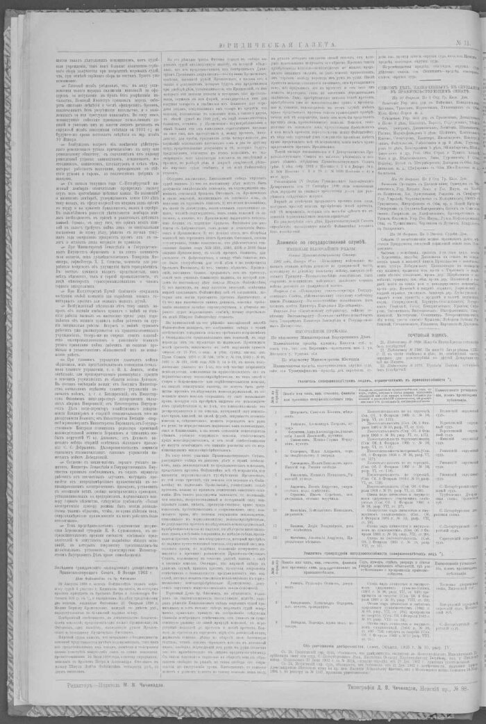 Юридическая газета : выходит без предварительной цензуры. - 1892, 4 января - [1906]. -Санкт-Петербург, 1892-1906. - "Юридическая газета" с бесплатным приложением Сборника решений Уголовного и Гражданского департаментов и общего собрания правительствующего сената, а с 1895 и Собраний узаконении и распоряжений правительства - выходила в Петербурге с января 1892 по 1906, 2 раза в неделю, по воскресеньям и четвергам. Редакторы - Е. Антонов, Д. В. Чичинадзе, М. В. Чичинадзе. Материалы газеты печатались под рубриками: Законодательная хроника в России, Обзор постановлений отечественного и иностранного законодательства, Статьи и заметки по вопросам, возникающим в судебной и административной практике, Корреспонденции из России, Выдающиеся судебные процессы, Речи известных адвокатов. С № 6 1906 стала выходить в виде брошюр. Алфавитный указатель статей за 1901 год: в № 32 за 30 декабря 1901 г.. - Алфавитный указатель к "Юридической газете" за 1892 и 1893 гг. - Санкт-Петербург, 1894. - Приложения: "Сборник решений Уголовного и Гражданского кассационных департаментов и Общего собрания Правительствующего сената" и "Собрание узаконений и распоряжений Правительства".