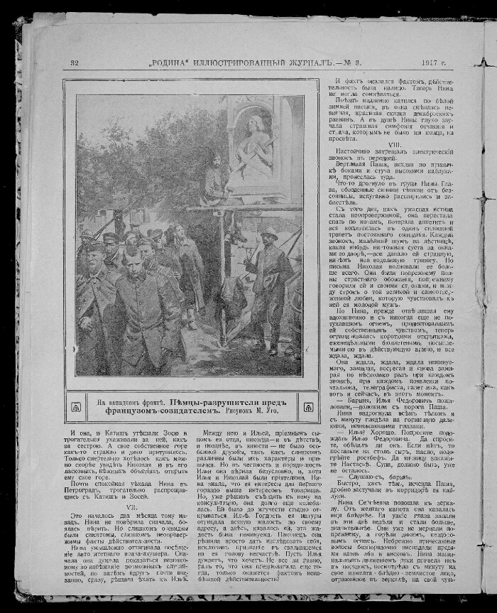 Родина : литературно-художественный семейный журнал с иллюстрированными отделами "Всемирное обозрение" и "Развлечение в часы отдыха". - Санкт-Петербург : Акционерное общество издательства А. А. Каспари, 1879-1917. - "Родина" - иллюстрированный журнал для семейного чтения, основан в Санкт-Петербурге в 1879 г. В. А. Захаровым, выходил ежемесячно, с 1883 г. – еженедельно. В 1879-1880 гг. выходило с приложением "Вестник народной помощи"; за 1884 г. - с приложением "Прогрессивное сельское хозяйство". В 1886 г. журнал приобрёл А. А. Каспари. С этого времени журнал начинает печатать ежемесячные приложения ("Развлечение в часы отдыха", иллюстрированное "Всемирное обозрение", еженедельная политическая и общественная газета "Родина") и до 1917 года издавался под его редакцией. С августа 1883 г. журнал реорганизован в газету и вновь начинает нумерацию выпусков. В 1888-1912 гг. издание выходит 2-мя параллельными частями с заглавием "Родина: еженедельный иллюстрированный журнал для семейного чтения" и "Родина: еженедельная газета политическая, общественная и литературная"; к каждому году имеется общий титульный лист с заглавием: "Родина: еженедельный иллюстрированный литературный журнал и политическая общественная газета"; На № 52 1911 г. самостоятельное издание газеты прекращено; в 1912 г. в каждом номере журнала имеется газетный отдел с заглавием: "Родина: еженедельные обзоры политики и общественной жизни: газетный отдел журнала "Родина". К 1917 г. выходило с приложением "Свободная Россия". Подзаголовок: 1878 Кн. 1 Народный журнал (с картинами); 1879 Кн. 2 - 1883 июнь/июль Ежемесячный журнал с картинами (с незначительными изменениями); 1883 № 1 (август) - 1885 Еженедельнная газета общественная и литературная; 1886-1887 Еженедельная иллюстрированная газета политическая, общественная и литературная (с незначительными изменениями); В журнале: 1888-1916 Иллюстрированный журнал для семейного чтения. (На обложке 1907 г. Литературно-художественный журнал и газета с иллюстрированными отделами "Всемирное обозрение" и "Развлечение в часы отдыха"; 1908-1916: Литературно-художественный семейный журнал с иллюстрированными отделами "Всемирное обозрение" и "Развлечение в часы отдыха"; в части номеров 1915-1916 г.: Еженедельный иллюстрированный журнал с бесплатным приложением и книгами романов); 1917 Еженедельный литературно-художественный журнал (На обложке: Литературно-художественный семейный журнал, в части номеров: ... с иллюстрированными отделами "Всемирное обозрение" и "Развлечение", в части номеров: Еженедельный иллюстрированный журнал с бесплатным приложением и книгами романов); В газете: 1888-1901 № 48 Еженедельная газета политическая, общественная и литературная; 1901 № 49 - 1903 Еженедельня газета. Политика, новости дня, общественная жизнь и пр.; 1904-1911 Еженедельная общественная и политическая газета (С 1909 г. ... Бесплатное приложение к журналу "Родина"). Издательство: 1879 - 1884 № 17 А. Траншель; 1884 № 18 - 1886 № 6, 16-17 И. Н. Пономарев; 1886 № 7-15 И. Н. Пономарев и В. М. Антонов; 1886 № 18 - 1913 № 42 А. А. Каспари; 1913 № 43 - 1914 № 34 издательница А. А. Каспари; 1914 № 35 - 1917 Акционерное общество издательства А. А. Каспари.