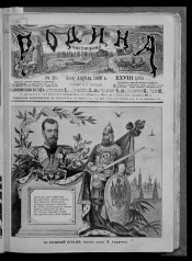 Родина : литературно-художественный семейный журнал с иллюстрированными отделами "Всемирное обозрение" и "Развлечение в часы отдыха". - Санкт-Петербург : Акционерное общество издательства А. А. Каспари, 1879-1917. - "Родина" - иллюстрированный журнал для семейного чтения, основан в Санкт-Петербурге в 1879 г. В. А. Захаровым, выходил ежемесячно, с 1883 г. – еженедельно. В 1879-1880 гг. выходило с приложением "Вестник народной помощи"; за 1884 г. - с приложением "Прогрессивное сельское хозяйство". В 1886 г. журнал приобрёл А. А. Каспари. С этого времени журнал начинает печатать ежемесячные приложения ("Развлечение в часы отдыха", иллюстрированное "Всемирное обозрение", еженедельная политическая и общественная газета "Родина") и до 1917 года издавался под его редакцией. С августа 1883 г. журнал реорганизован в газету и вновь начинает нумерацию выпусков. В 1888-1912 гг. издание выходит 2-мя параллельными частями с заглавием "Родина: еженедельный иллюстрированный журнал для семейного чтения" и "Родина: еженедельная газета политическая, общественная и литературная"; к каждому году имеется общий титульный лист с заглавием: "Родина: еженедельный иллюстрированный литературный журнал и политическая общественная газета"; На № 52 1911 г. самостоятельное издание газеты прекращено; в 1912 г. в каждом номере журнала имеется газетный отдел с заглавием: "Родина: еженедельные обзоры политики и общественной жизни: газетный отдел журнала "Родина". К 1917 г. выходило с приложением "Свободная Россия". Подзаголовок: 1878 Кн. 1 Народный журнал (с картинами); 1879 Кн. 2 - 1883 июнь/июль Ежемесячный журнал с картинами (с незначительными изменениями); 1883 № 1 (август) - 1885 Еженедельнная газета общественная и литературная; 1886-1887 Еженедельная иллюстрированная газета политическая, общественная и литературная (с незначительными изменениями); В журнале: 1888-1916 Иллюстрированный журнал для семейного чтения. (На обложке 1907 г. Литературно-художественный журнал и газета с иллюстрированными отделами "Всемирное обозрение" и "Развлечение в часы отдыха"; 1908-1916: Литературно-художественный семейный журнал с иллюстрированными отделами "Всемирное обозрение" и "Развлечение в часы отдыха"; в части номеров 1915-1916 г.: Еженедельный иллюстрированный журнал с бесплатным приложением и книгами романов); 1917 Еженедельный литературно-художественный журнал (На обложке: Литературно-художественный семейный журнал, в части номеров: ... с иллюстрированными отделами "Всемирное обозрение" и "Развлечение", в части номеров: Еженедельный иллюстрированный журнал с бесплатным приложением и книгами романов); В газете: 1888-1901 № 48 Еженедельная газета политическая, общественная и литературная; 1901 № 49 - 1903 Еженедельня газета. Политика, новости дня, общественная жизнь и пр.; 1904-1911 Еженедельная общественная и политическая газета (С 1909 г. ... Бесплатное приложение к журналу "Родина"). Издательство: 1879 - 1884 № 17 А. Траншель; 1884 № 18 - 1886 № 6, 16-17 И. Н. Пономарев; 1886 № 7-15 И. Н. Пономарев и В. М. Антонов; 1886 № 18 - 1913 № 42 А. А. Каспари; 1913 № 43 - 1914 № 34 издательница А. А. Каспари; 1914 № 35 - 1917 Акционерное общество издательства А. А. Каспари.