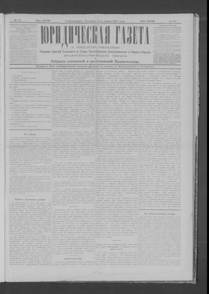 Юридическая газета : выходит без предварительной цензуры. - 1892, 4 января - [1906]. -Санкт-Петербург, 1892-1906. - "Юридическая газета" с бесплатным приложением Сборника решений Уголовного и Гражданского департаментов и общего собрания правительствующего сената, а с 1895 и Собраний узаконении и распоряжений правительства - выходила в Петербурге с января 1892 по 1906, 2 раза в неделю, по воскресеньям и четвергам. Редакторы - Е. Антонов, Д. В. Чичинадзе, М. В. Чичинадзе. Материалы газеты печатались под рубриками: Законодательная хроника в России, Обзор постановлений отечественного и иностранного законодательства, Статьи и заметки по вопросам, возникающим в судебной и административной практике, Корреспонденции из России, Выдающиеся судебные процессы, Речи известных адвокатов. С № 6 1906 стала выходить в виде брошюр. Алфавитный указатель статей за 1901 год: в № 32 за 30 декабря 1901 г.. - Алфавитный указатель к "Юридической газете" за 1892 и 1893 гг. - Санкт-Петербург, 1894. - Приложения: "Сборник решений Уголовного и Гражданского кассационных департаментов и Общего собрания Правительствующего сената" и "Собрание узаконений и распоряжений Правительства".