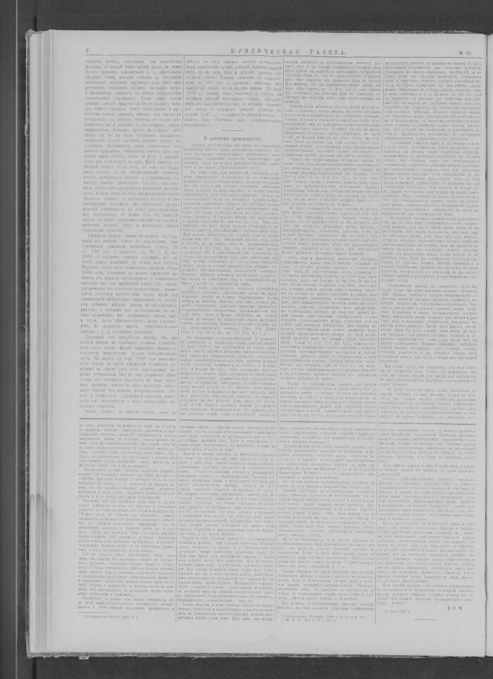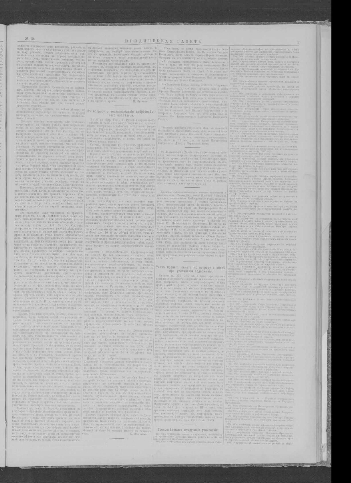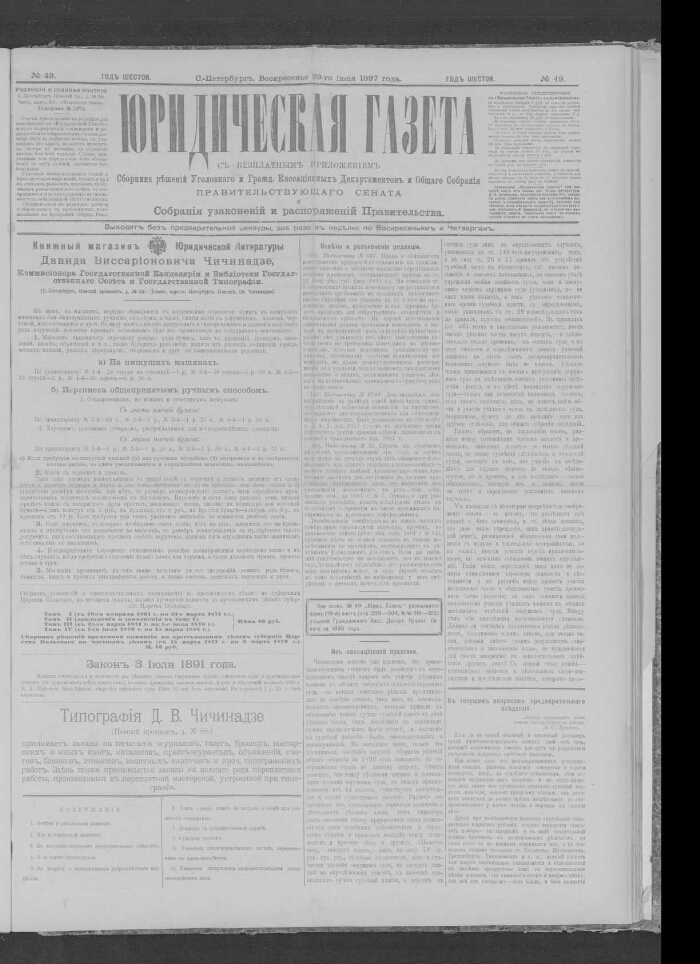 Юридическая газета : выходит без предварительной цензуры. - 1892, 4 января - [1906]. -Санкт-Петербург, 1892-1906. - "Юридическая газета" с бесплатным приложением Сборника решений Уголовного и Гражданского департаментов и общего собрания правительствующего сената, а с 1895 и Собраний узаконении и распоряжений правительства - выходила в Петербурге с января 1892 по 1906, 2 раза в неделю, по воскресеньям и четвергам. Редакторы - Е. Антонов, Д. В. Чичинадзе, М. В. Чичинадзе. Материалы газеты печатались под рубриками: Законодательная хроника в России, Обзор постановлений отечественного и иностранного законодательства, Статьи и заметки по вопросам, возникающим в судебной и административной практике, Корреспонденции из России, Выдающиеся судебные процессы, Речи известных адвокатов. С № 6 1906 стала выходить в виде брошюр. Алфавитный указатель статей за 1901 год: в № 32 за 30 декабря 1901 г.. - Алфавитный указатель к "Юридической газете" за 1892 и 1893 гг. - Санкт-Петербург, 1894. - Приложения: "Сборник решений Уголовного и Гражданского кассационных департаментов и Общего собрания Правительствующего сената" и "Собрание узаконений и распоряжений Правительства".