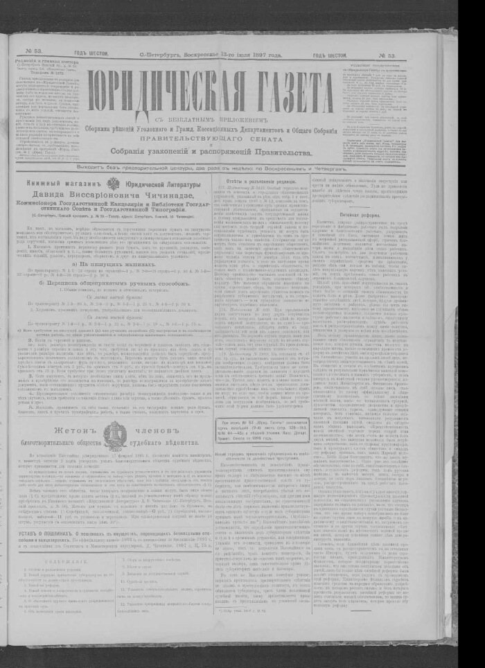 Юридическая газета : выходит без предварительной цензуры. - 1892, 4 января - [1906]. -Санкт-Петербург, 1892-1906. - "Юридическая газета" с бесплатным приложением Сборника решений Уголовного и Гражданского департаментов и общего собрания правительствующего сената, а с 1895 и Собраний узаконении и распоряжений правительства - выходила в Петербурге с января 1892 по 1906, 2 раза в неделю, по воскресеньям и четвергам. Редакторы - Е. Антонов, Д. В. Чичинадзе, М. В. Чичинадзе. Материалы газеты печатались под рубриками: Законодательная хроника в России, Обзор постановлений отечественного и иностранного законодательства, Статьи и заметки по вопросам, возникающим в судебной и административной практике, Корреспонденции из России, Выдающиеся судебные процессы, Речи известных адвокатов. С № 6 1906 стала выходить в виде брошюр. Алфавитный указатель статей за 1901 год: в № 32 за 30 декабря 1901 г.. - Алфавитный указатель к "Юридической газете" за 1892 и 1893 гг. - Санкт-Петербург, 1894. - Приложения: "Сборник решений Уголовного и Гражданского кассационных департаментов и Общего собрания Правительствующего сената" и "Собрание узаконений и распоряжений Правительства".