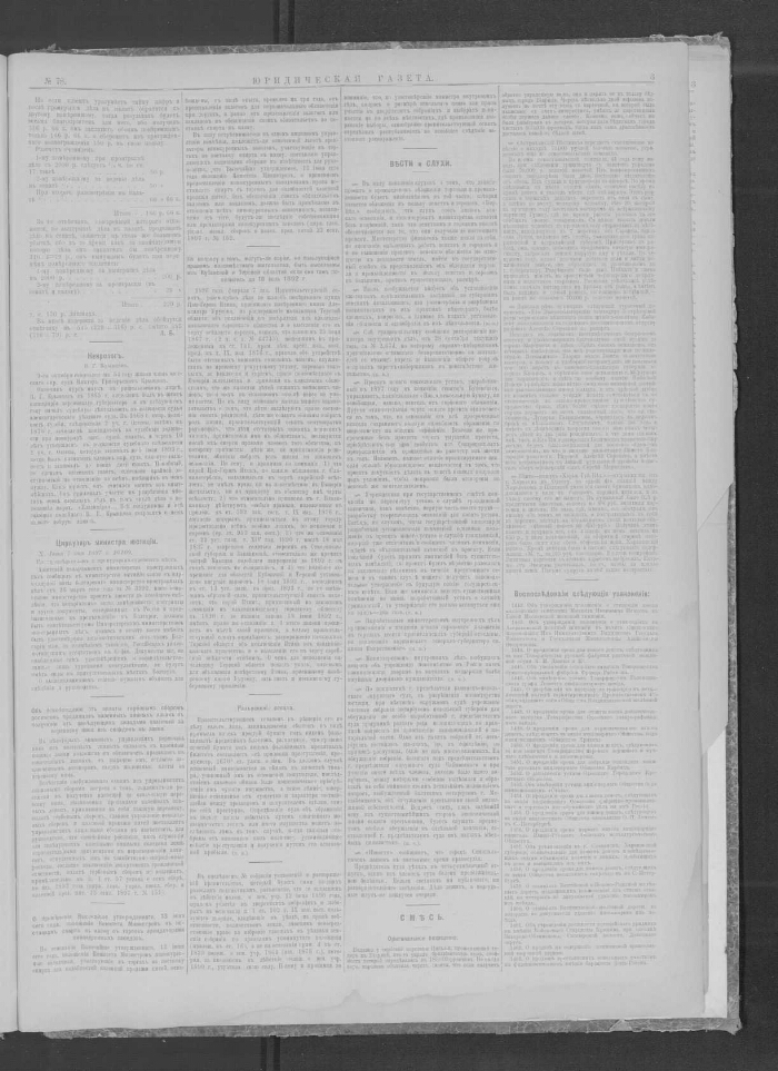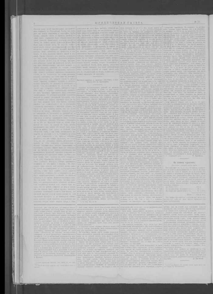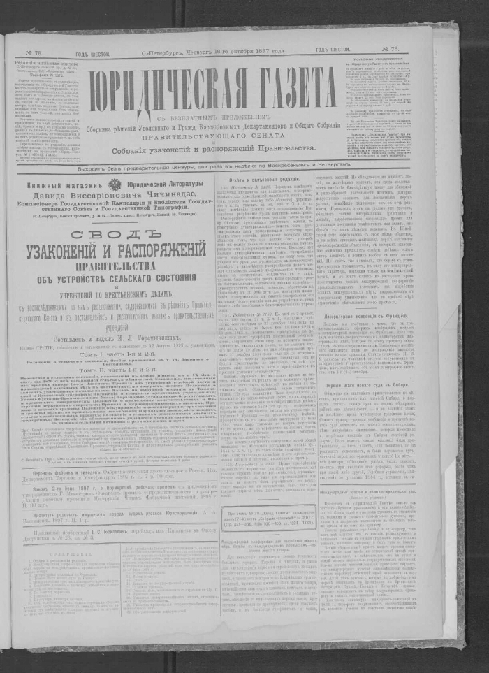 Юридическая газета : выходит без предварительной цензуры. - 1892, 4 января - [1906]. -Санкт-Петербург, 1892-1906. - "Юридическая газета" с бесплатным приложением Сборника решений Уголовного и Гражданского департаментов и общего собрания правительствующего сената, а с 1895 и Собраний узаконении и распоряжений правительства - выходила в Петербурге с января 1892 по 1906, 2 раза в неделю, по воскресеньям и четвергам. Редакторы - Е. Антонов, Д. В. Чичинадзе, М. В. Чичинадзе. Материалы газеты печатались под рубриками: Законодательная хроника в России, Обзор постановлений отечественного и иностранного законодательства, Статьи и заметки по вопросам, возникающим в судебной и административной практике, Корреспонденции из России, Выдающиеся судебные процессы, Речи известных адвокатов. С № 6 1906 стала выходить в виде брошюр. Алфавитный указатель статей за 1901 год: в № 32 за 30 декабря 1901 г.. - Алфавитный указатель к "Юридической газете" за 1892 и 1893 гг. - Санкт-Петербург, 1894. - Приложения: "Сборник решений Уголовного и Гражданского кассационных департаментов и Общего собрания Правительствующего сената" и "Собрание узаконений и распоряжений Правительства".
