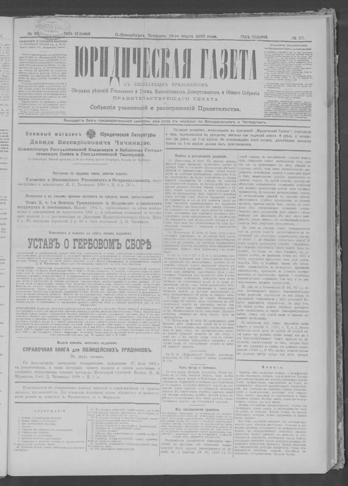 Юридическая газета : выходит без предварительной цензуры. - 1892, 4 января - [1906]. -Санкт-Петербург, 1892-1906. - "Юридическая газета" с бесплатным приложением Сборника решений Уголовного и Гражданского департаментов и общего собрания правительствующего сената, а с 1895 и Собраний узаконении и распоряжений правительства - выходила в Петербурге с января 1892 по 1906, 2 раза в неделю, по воскресеньям и четвергам. Редакторы - Е. Антонов, Д. В. Чичинадзе, М. В. Чичинадзе. Материалы газеты печатались под рубриками: Законодательная хроника в России, Обзор постановлений отечественного и иностранного законодательства, Статьи и заметки по вопросам, возникающим в судебной и административной практике, Корреспонденции из России, Выдающиеся судебные процессы, Речи известных адвокатов. С № 6 1906 стала выходить в виде брошюр. Алфавитный указатель статей за 1901 год: в № 32 за 30 декабря 1901 г.. - Алфавитный указатель к "Юридической газете" за 1892 и 1893 гг. - Санкт-Петербург, 1894. - Приложения: "Сборник решений Уголовного и Гражданского кассационных департаментов и Общего собрания Правительствующего сената" и "Собрание узаконений и распоряжений Правительства".