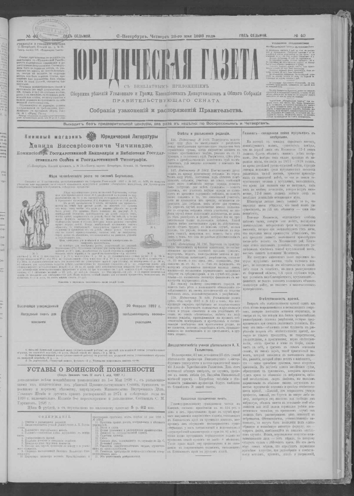Юридическая газета : выходит без предварительной цензуры. - 1892, 4 января - [1906]. -Санкт-Петербург, 1892-1906. - "Юридическая газета" с бесплатным приложением Сборника решений Уголовного и Гражданского департаментов и общего собрания правительствующего сената, а с 1895 и Собраний узаконении и распоряжений правительства - выходила в Петербурге с января 1892 по 1906, 2 раза в неделю, по воскресеньям и четвергам. Редакторы - Е. Антонов, Д. В. Чичинадзе, М. В. Чичинадзе. Материалы газеты печатались под рубриками: Законодательная хроника в России, Обзор постановлений отечественного и иностранного законодательства, Статьи и заметки по вопросам, возникающим в судебной и административной практике, Корреспонденции из России, Выдающиеся судебные процессы, Речи известных адвокатов. С № 6 1906 стала выходить в виде брошюр. Алфавитный указатель статей за 1901 год: в № 32 за 30 декабря 1901 г.. - Алфавитный указатель к "Юридической газете" за 1892 и 1893 гг. - Санкт-Петербург, 1894. - Приложения: "Сборник решений Уголовного и Гражданского кассационных департаментов и Общего собрания Правительствующего сената" и "Собрание узаконений и распоряжений Правительства".