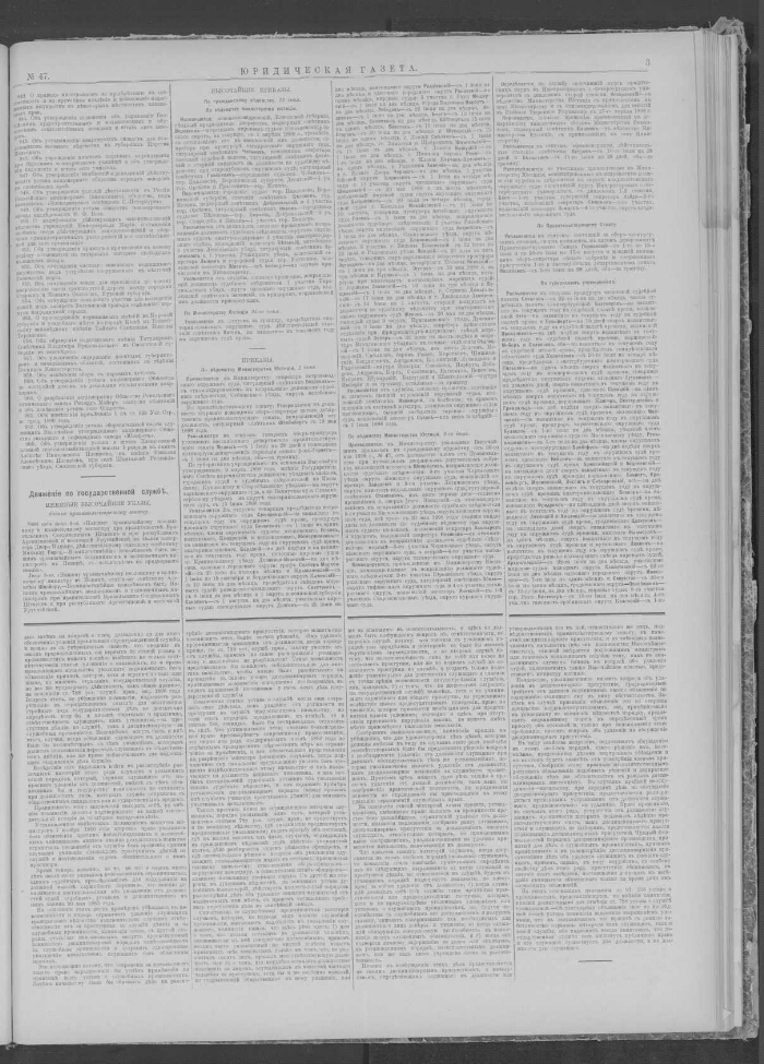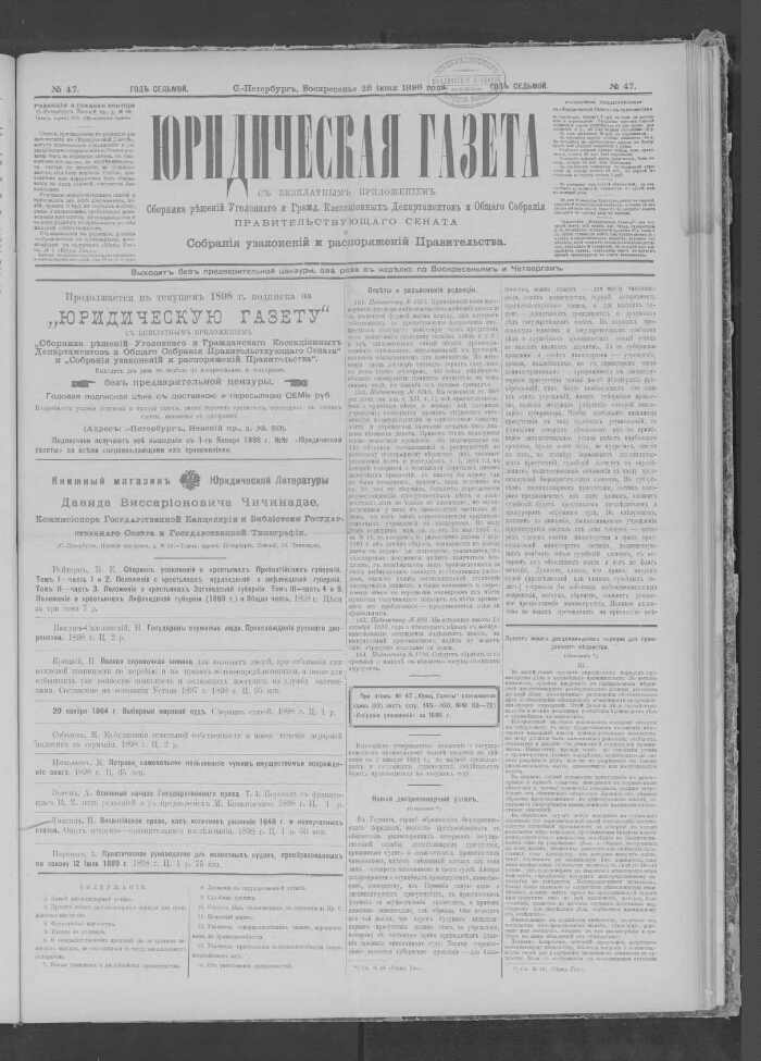 Юридическая газета : выходит без предварительной цензуры. - 1892, 4 января - [1906]. -Санкт-Петербург, 1892-1906. - "Юридическая газета" с бесплатным приложением Сборника решений Уголовного и Гражданского департаментов и общего собрания правительствующего сената, а с 1895 и Собраний узаконении и распоряжений правительства - выходила в Петербурге с января 1892 по 1906, 2 раза в неделю, по воскресеньям и четвергам. Редакторы - Е. Антонов, Д. В. Чичинадзе, М. В. Чичинадзе. Материалы газеты печатались под рубриками: Законодательная хроника в России, Обзор постановлений отечественного и иностранного законодательства, Статьи и заметки по вопросам, возникающим в судебной и административной практике, Корреспонденции из России, Выдающиеся судебные процессы, Речи известных адвокатов. С № 6 1906 стала выходить в виде брошюр. Алфавитный указатель статей за 1901 год: в № 32 за 30 декабря 1901 г.. - Алфавитный указатель к "Юридической газете" за 1892 и 1893 гг. - Санкт-Петербург, 1894. - Приложения: "Сборник решений Уголовного и Гражданского кассационных департаментов и Общего собрания Правительствующего сената" и "Собрание узаконений и распоряжений Правительства".
