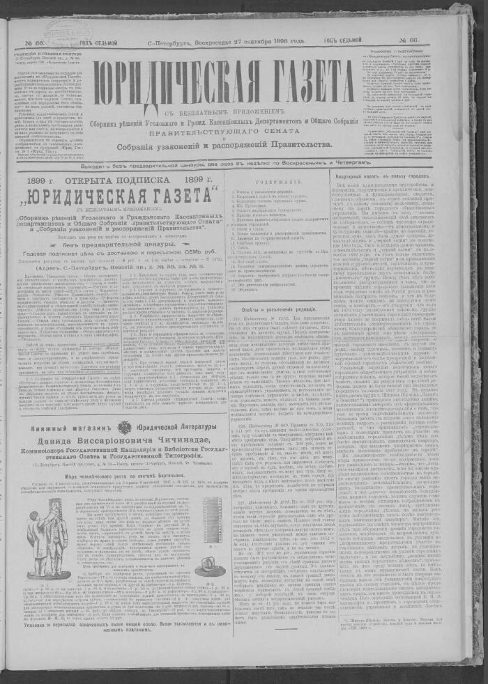 Юридическая газета : выходит без предварительной цензуры. - 1892, 4 января - [1906]. -Санкт-Петербург, 1892-1906. - "Юридическая газета" с бесплатным приложением Сборника решений Уголовного и Гражданского департаментов и общего собрания правительствующего сената, а с 1895 и Собраний узаконении и распоряжений правительства - выходила в Петербурге с января 1892 по 1906, 2 раза в неделю, по воскресеньям и четвергам. Редакторы - Е. Антонов, Д. В. Чичинадзе, М. В. Чичинадзе. Материалы газеты печатались под рубриками: Законодательная хроника в России, Обзор постановлений отечественного и иностранного законодательства, Статьи и заметки по вопросам, возникающим в судебной и административной практике, Корреспонденции из России, Выдающиеся судебные процессы, Речи известных адвокатов. С № 6 1906 стала выходить в виде брошюр. Алфавитный указатель статей за 1901 год: в № 32 за 30 декабря 1901 г.. - Алфавитный указатель к "Юридической газете" за 1892 и 1893 гг. - Санкт-Петербург, 1894. - Приложения: "Сборник решений Уголовного и Гражданского кассационных департаментов и Общего собрания Правительствующего сената" и "Собрание узаконений и распоряжений Правительства".