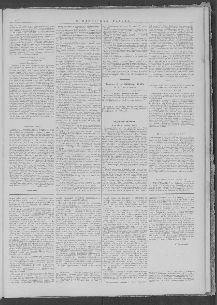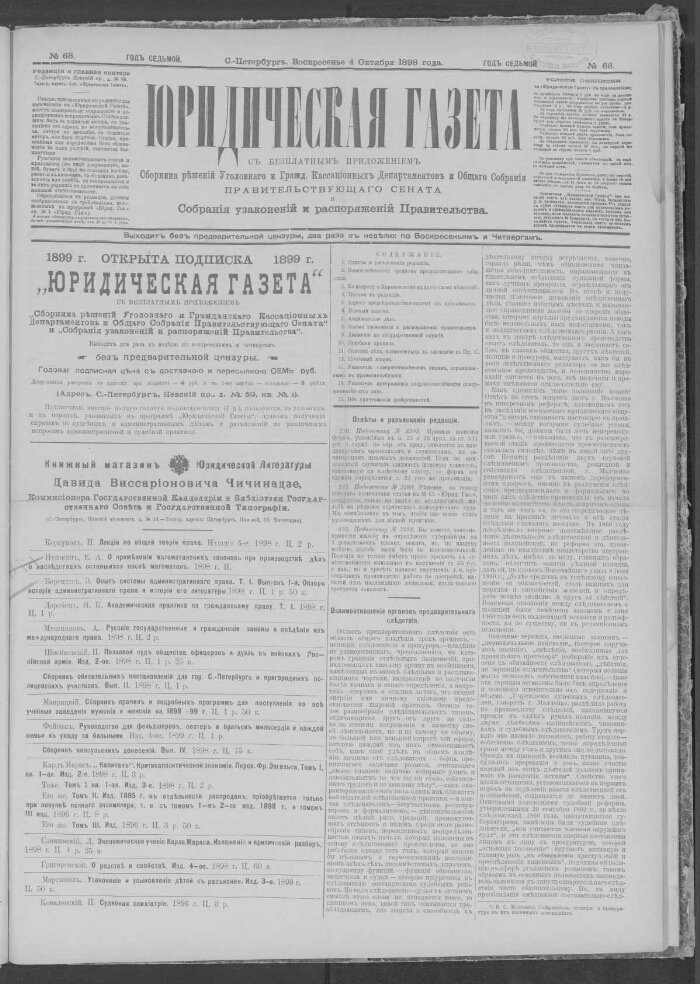 Юридическая газета : выходит без предварительной цензуры. - 1892, 4 января - [1906]. -Санкт-Петербург, 1892-1906. - "Юридическая газета" с бесплатным приложением Сборника решений Уголовного и Гражданского департаментов и общего собрания правительствующего сената, а с 1895 и Собраний узаконении и распоряжений правительства - выходила в Петербурге с января 1892 по 1906, 2 раза в неделю, по воскресеньям и четвергам. Редакторы - Е. Антонов, Д. В. Чичинадзе, М. В. Чичинадзе. Материалы газеты печатались под рубриками: Законодательная хроника в России, Обзор постановлений отечественного и иностранного законодательства, Статьи и заметки по вопросам, возникающим в судебной и административной практике, Корреспонденции из России, Выдающиеся судебные процессы, Речи известных адвокатов. С № 6 1906 стала выходить в виде брошюр. Алфавитный указатель статей за 1901 год: в № 32 за 30 декабря 1901 г.. - Алфавитный указатель к "Юридической газете" за 1892 и 1893 гг. - Санкт-Петербург, 1894. - Приложения: "Сборник решений Уголовного и Гражданского кассационных департаментов и Общего собрания Правительствующего сената" и "Собрание узаконений и распоряжений Правительства".