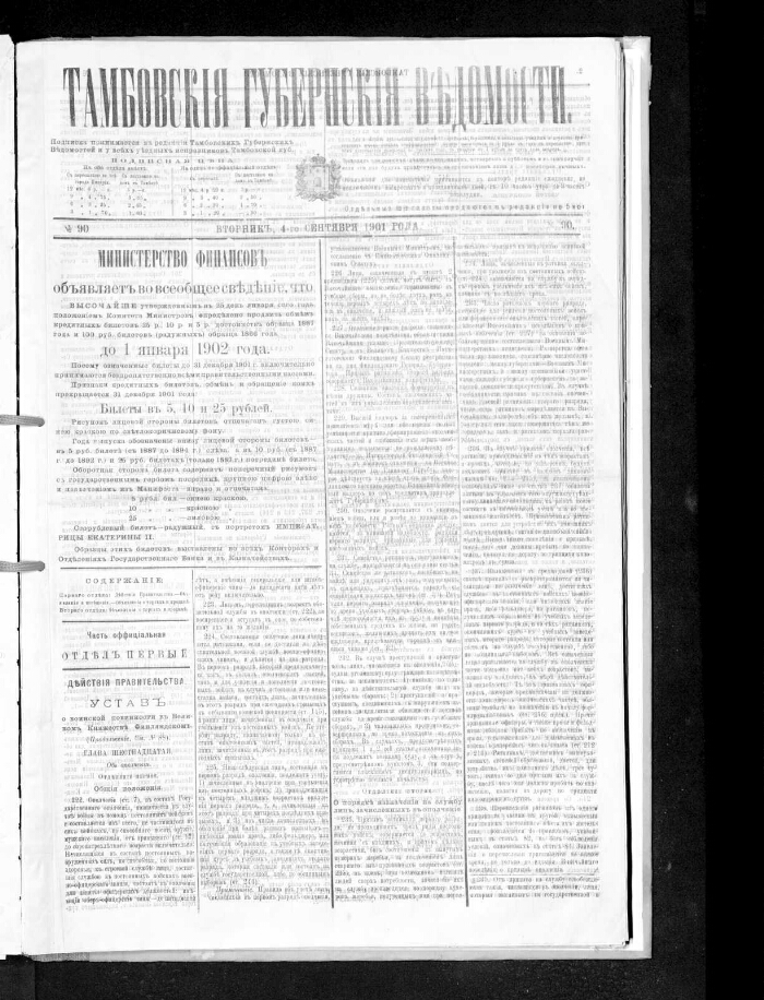 1901, № 90 (4 сентября). - Тип. губ. правления, 1901. -4, 4 с. : табл.. - Вторник. Выходят три раза в неделю: по вторникам, четвергам и субботам и в том случае, если эти дни будут праздничные, за исключением лишь дней послепраздничных. Содерж.: Действия Правительства. Объявления и извещения. Объявления о торгах и продаже. Объявления о торгах и продаже. - Экз.: без обл.