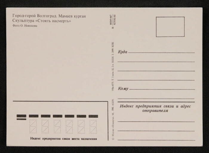 Город-герой Волгоград. Мамаев курган. Скульптура "Стоять насмерть" [Изоматериал : электронный ресурс] : [открытка] / фото О. Новикова. - Электронные данные (2 файла : 3 МБ). -(Санкт-Петербург: Президентская библиотека , 2014). - Режим доступа: интернет-портал Президентской библиотеки. Заглавие с экрана. Электронная репродукция открытки: Город-герой Волгоград. Мамаев курган. Скульптура "Стоять насмерть" [Изоматериал] / фото О. Новикова. Москва : Планета, 1981. 1 открытка : цветной офсет. 3113211. А 11291. 2 коп. Тираж 1 млн. экз. Местонахождение: Детский музей открытки, Санкт-Петербург. Копирование пользователями не разрешается.