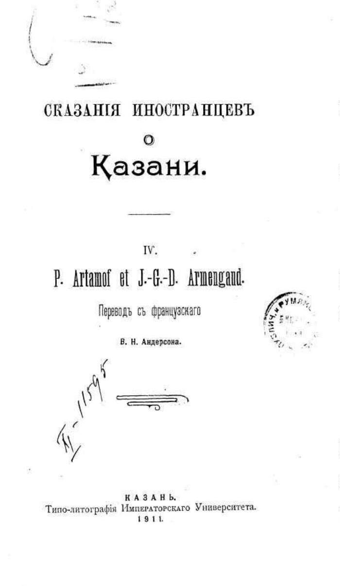 Сказания иностранцев о Казани : 1-3 / [Н. Катанов]. - [Казань] : типо-лит. Имп. Казанск. ун-та, 1903-1911. -2 т. ; 24. - Авт. указан в конце текста. Без тит. л. и обл.