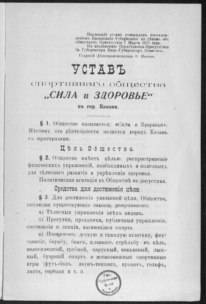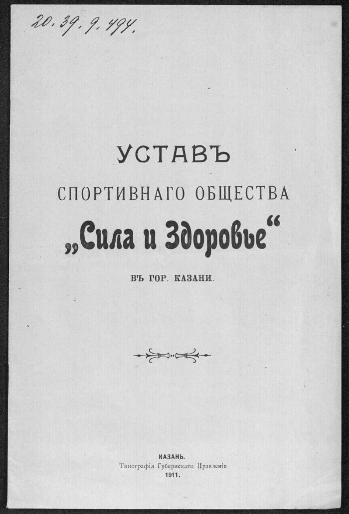 Устав спортивного общества "Сила и Здоровье" в гор. Казани : [утвержден 7 марта 1911 г.]. - Казань : Типография Губернского Правления, 1911. -8 с. ; 23 см. - Без титульного листа. Описано по обложке.