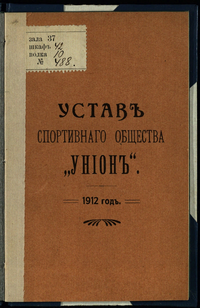 Устав спортивного общества "Унион". 1912 год : [утвержден 15 марта 1912 года]. - Санкт-Петербург : Паровая типография и литография М. Розеноер, 1912. -23 с. ; 17 см. -