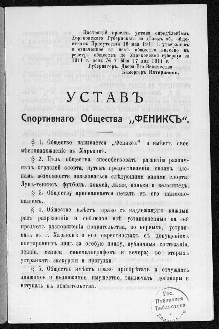 Устав спортивного общества "Феникс" : [утвержден 16 мая 1911 года]. - Харьков : типография В. Бенгис, 1911. -7 с. ; 17 см. - Без титульного листа. Описано по обложке.