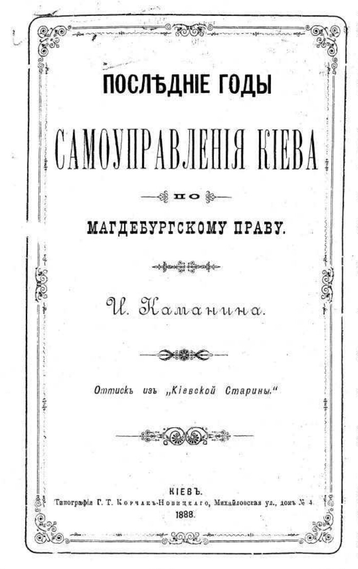 Последние годы самоуправления Киева по Магдебургскому праву / [Соч.] И. Каманина. - Киев : тип. Г.Т. Корчак-Новицкого, 1888. -91 с. ; 24. - Библиогр. в прим.. - Отт. из "Киев. старины". - Без тит. л.