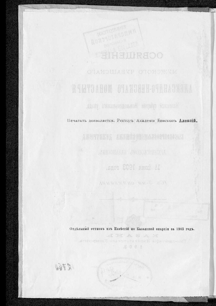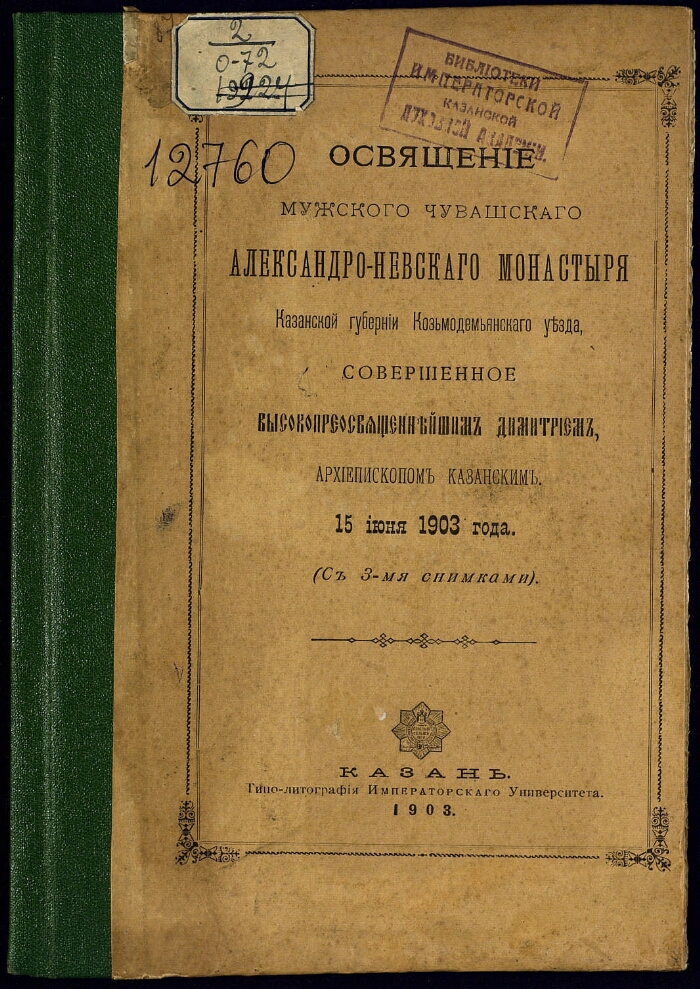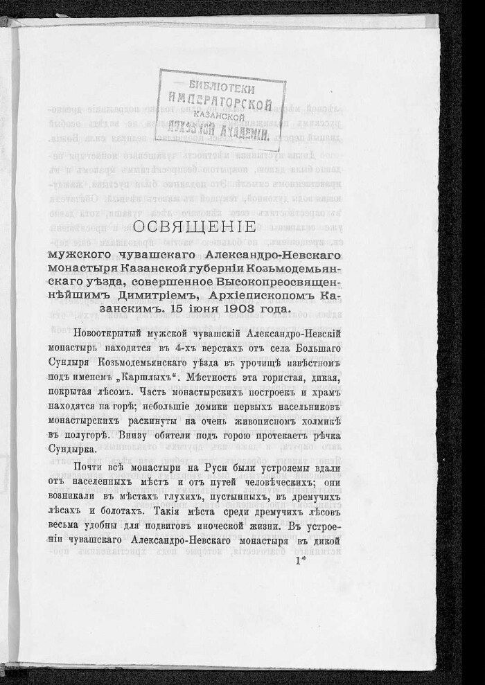 Освящение Мужского чувашского Александро-Невского монастыря Казанской губернии Козьмодемьянского уезда, совершенное высокопреосвященнейшим Димитрием, архиепископом Казанским, 15 июня 1903 года : (с 3-мя снимками). - Казань : Типо-литография Императорского университета, 1903. -18 с., [3] л. ил. ; 26 см. - Отдельный оттиск из Известий по Казанской епархии за 1903 год. Экземпляр Чувашского государственного института гуманитарных наук со штампом: Библиотеки Императорской Казанской духовной академии.
