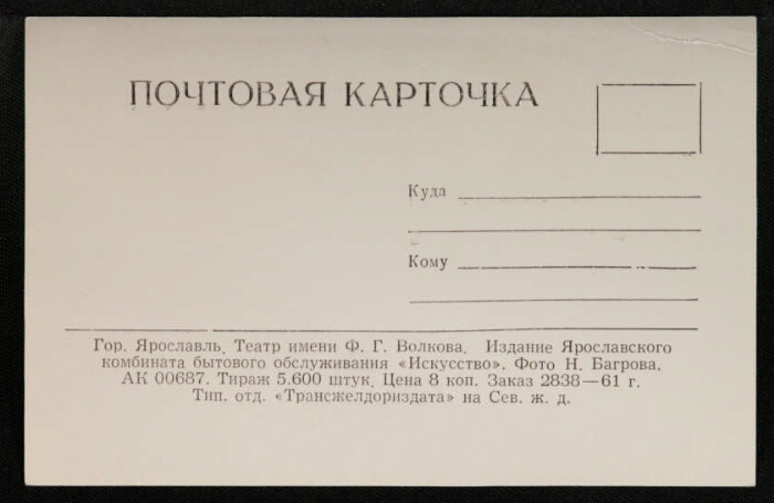 Гор. Ярославль. Театр имени Ф. Г. Волкова [Изоматериал : электронный ресурс] : [открытка] / фото Н. Багрова. - Электронные данные (2 файла : 1,8 МБ). -(Санкт-Петербург: Президентская библиотека , 2014). - Режим доступа: интернет-портал Президентской библиотеки. Заглавие с экрана. Электронная репродукция почтовой карточки: Гор. Ярославль. Театр имени Ф. Г. Волкова [Изоматериал] / фото Н. Багрова. Издание Ярославского комбината бытового обслуживания "Искусство", 1961. 1 открытка : офсет. АК 00687. 8 коп. Тираж 5600 экз. Местонахождение: Детский музей открытки, Санкт-Петербург. Копирование пользователями не разрешается.