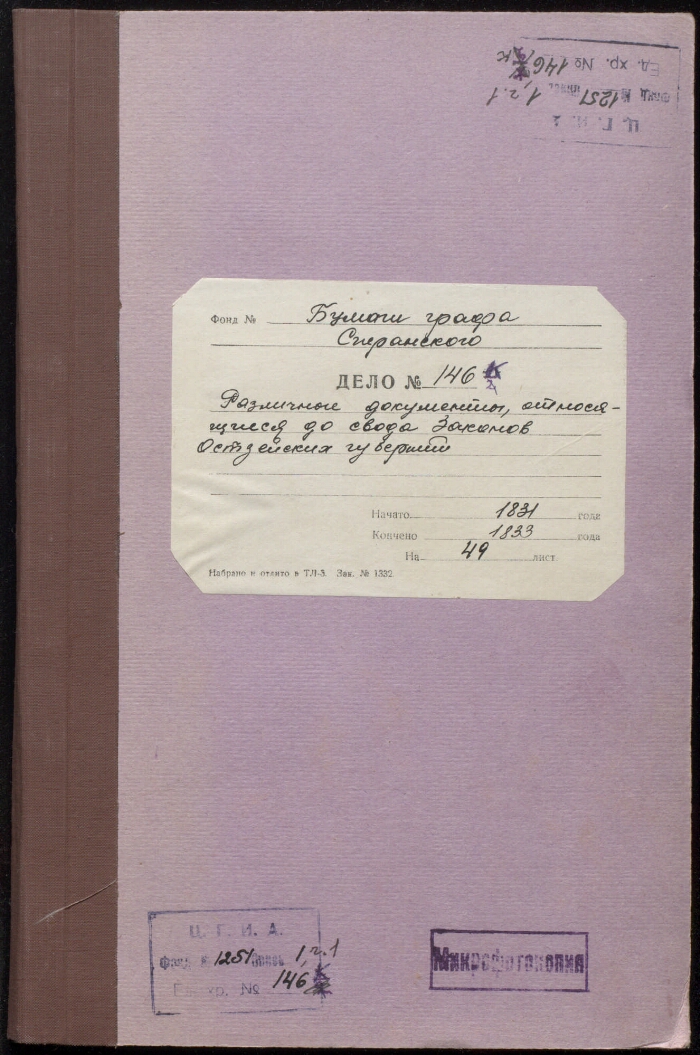 Идентификатор 0e965943-4c76-4d51-b9e5-7344ef06880c Заголовок Различные документы, относящиеся до Свода законов Остзейских губерний Даты 1831 Примечания Рукописный текст. ЧернилаАрхивный шифр: Ф. 1251. Оп. 1. Ч. 1. Д. 146 к) Язык текста Русский Уровень Дело Шифр хранения РГИА. 1251 / 1 / 146 к) Организация-создатель записи РГИА Описи 1803-1847 гг. Объем 50 листов Фонд Бумаги М. М. Сперанского Формат отображения Архивное описание RUSMARC В коллекциях Президентская библиотека – учителям: обучение с использованием первоисточников → Коллекции → Предметы: → История → Общие коллекции → Российский народ → Россия в лицах → Государственные и политические деятели → Государственные деятели XVIII – начала XX века → С → М. М. Сперанский (1772–1839) → М. М. Сперанский (1772–1839) → Жизнь и деятельность → Деятельность М. М. Сперанского в 1821–1839 гг. по систематизации и кодификации законодательства → Свод законов → Отрасли → Губернское управление → Бывшие территории Российской империи → Прибалтика → Свод законов Остзейских губерний