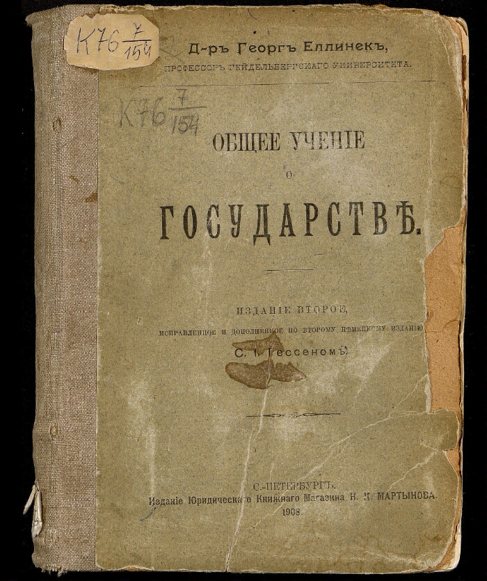 Общее учение о государстве / Д-р Георг Еллинек, профессор Гейдельбергского университета. - Издание 2-е, исправленное и дополненное по 2-му немецкому изданию С. И. Гессеном. -Санкт-Петербург : издание Юридического книжного магазина Н. К. Мартынов, 1908. -XXIV, 599 с. ; 22 см. - (Право современного государства ; Т. 1). - Библиография в подстрочных примечаниях. - Экземпляр ГПИБ со штампом: Библиотека-читальня рабочих и служащих заводов Парвиайнен.