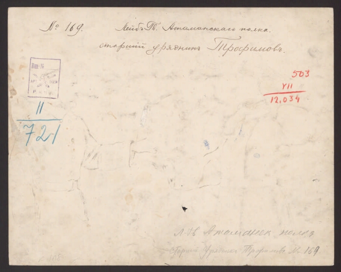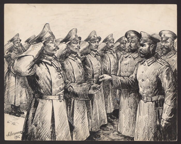 Старший урядник лейб-гвардии Атаманского полка Трофимов получает молитвенник лично от Николая II [Изоматериал] : [рисунок] / [рисовал] М. Мизернюк. - 1915. - Бумага, тушь, перо. - (Галерея Георгиевских кавалеров Первой мировой войны). - Режим доступа: интернет-портал Президентской библиотеки. На лицевой стороне: в левом нижнем углу подпись и дата: М. Мизернюк. 1915 г. Электронная репродукция (2 файла, JPEG : 14,7 МБ). На оборотной стороне надпись: № 169. Лейб гв. Атаманского полка старший урядник Трофимов, инвентарные номера. Копирование пользователями не разрешается. Материалы Трофейной комиссии в собрании Военно-исторического музея артиллерии, инженерных войск и войск связи. На рисунке - изображение старшего урядника лейб-гвардии Атаманского полка Трофимова, который вместе с другими казаками получает молитвенник лично от Николая II. 1914-1916 гг.