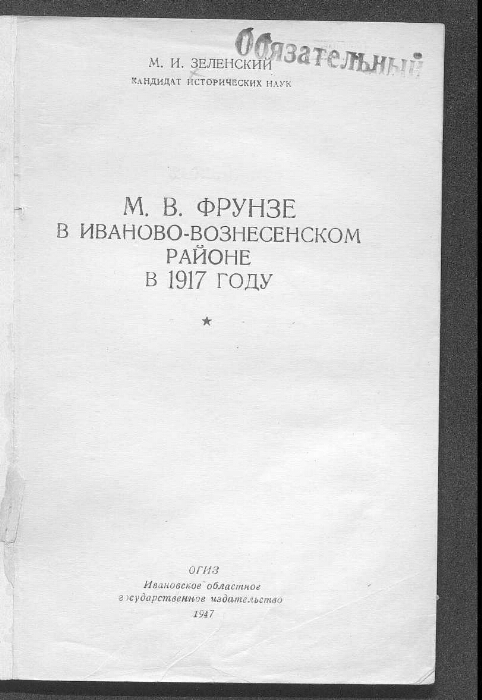 М. В. Фрунзе в Иваново-Вознесенском районе в 1917 году / М. И. Зеленский, кандидат исторических наук. - [Иваново] : ОГИЗ, Ивановское областное государственное издательство, 1947. -86, [2] с. : портр. ; 19 см. - Библиография в подстрочных примечаниях.