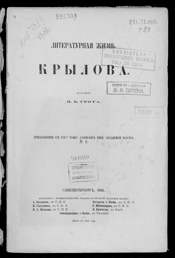 Литературная жизнь Крылова / [соч.] академика Я. К. Грота. - Санкт-Петербург : типография Императорской Академии наук, 1868. -[2], 47 с. : табл.. - Библиография в подстрочных примечаниях. - Приложение к XIV тому Записок Императорской Академии наук № 2. - На титульном листе штамп: Книги из собрания П. К. Симони.
