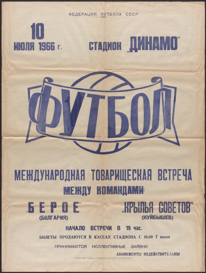 Футбол. Международная товарищеская встреча между командами: "Берое" (Болгария) – "Крылья Советов" (Куйбышев) : 10 июля 1966 г., стадион "Динамо" : [афиша] / Федерация футбола СССР. - Электронные данные (2 файла, JPEG : 45,4 МБ). -(Санкт-Петербург: Президентская библиотека , 2017). - Режим доступа: интернет-портал Президентской библиотеки. Заглавие с экрана. Начало встречи в 19 час. Билеты продаются в кассах стадиона с 10.00 7 июля. Принимаются коллективные заявки. Абонементы недействительны. Электронная репродукция афиши: Футбол. Международная товарищеская встреча между командами: "Берое" (Болгария) – "Крылья Советов" (Куйбышев) : 10 июля 1966 г., стадион "Динамо" / Федерация футбола СССР. Куйбышев : тип. ГПТУ № 7, [1966]. 1 лист : цв. шрифт (фиолетовый) ; 90,5х68,5 см. Тираж 130 экз. Местонахождение: Самарская ОУНБ. Копирование пользователями не разрешается.